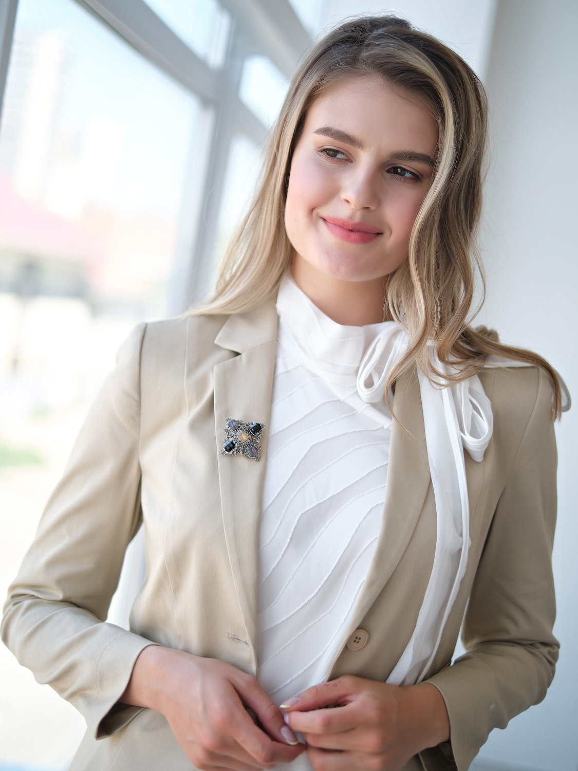Роскошная брошь в форме ромба. Выполнена из комбинированных материалов с использованием горного хрусталя.