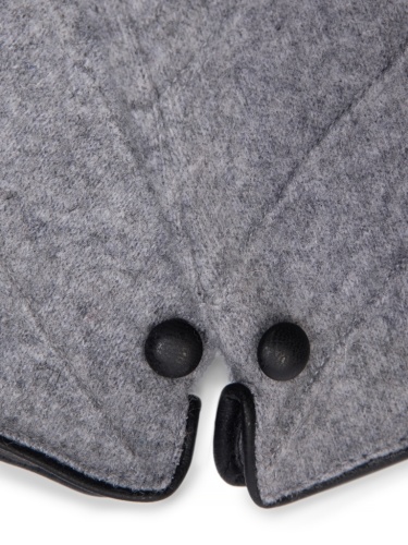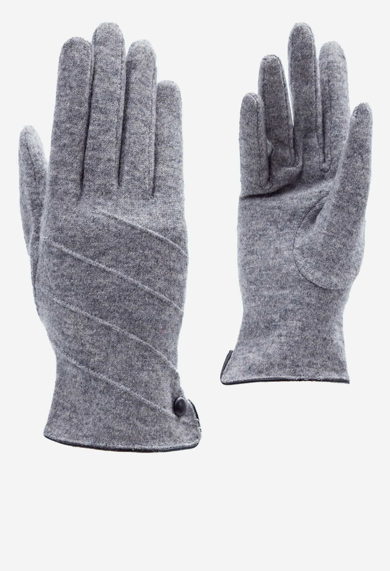 Перчатки выполнены из трикотажной шерсти. Состав трикотажа: 80% шерсть, 20% нейлон. Без подкладки. Отделка - декоративные швы на лицевой стороне. Край манжеты и декоративная пуговица обтянуты заменителем кожи. Длина манжеты от нижней точки большого пальца до края перчатки - 6,5 см. Длина пальцев - средняя.