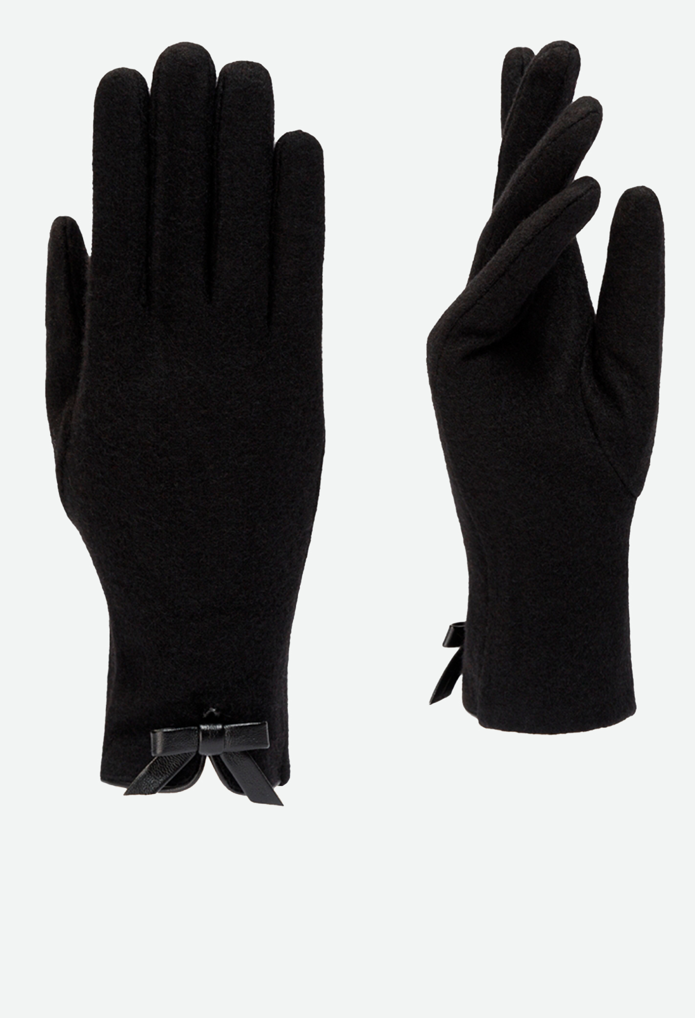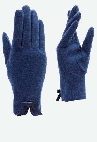 Перчатки выполнены из трикотажной шерсти. Состав трикотажа: 80% шерсть, 20% нейлон. Без подкладки. Отделка - декоративный бантик. Длина манжеты от нижней точки большого пальца до края перчатки - 6 см. Длина пальцев - средняя.