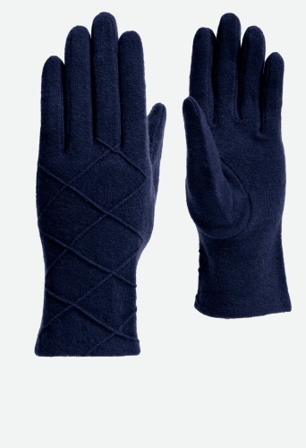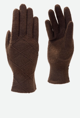 Перчатки выполнены из трикотажной шерсти. Состав трикотажа: 80% шерсть, 20% нейлон. Без подкладки. Отделка - декоративные строчки ромбами на лицевой стороне. Длина манжеты от нижней точки большого пальца до края перчатки 5 см. Длина пальцев - средняя.