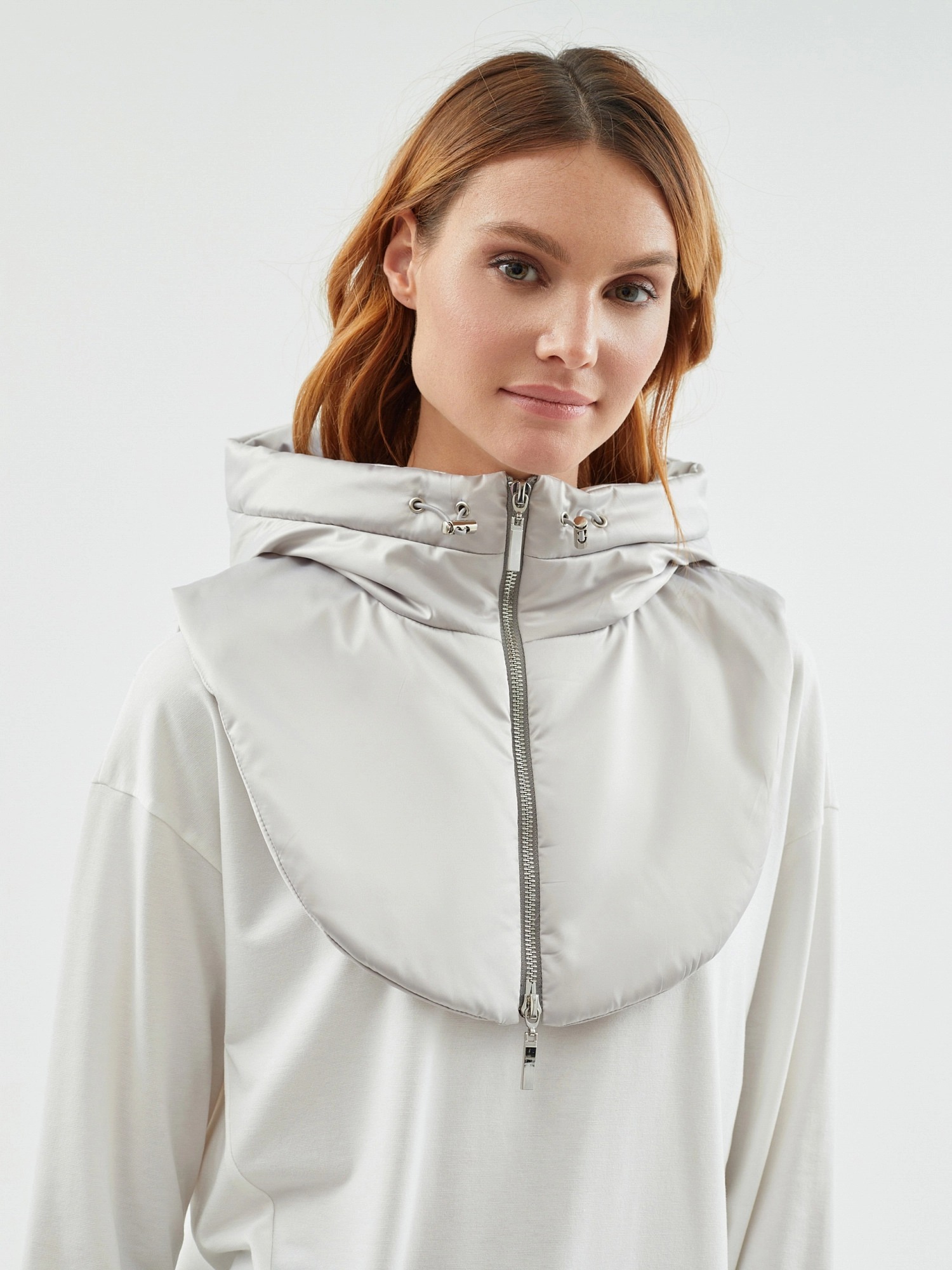Съемный капюшон с манишкой из плащевой ткани серебристого цвета. Капюшон на молнии, имеет резинку и два фиксатора для регулирования объема капюшона. Капюшон очень теплый, внутрь встроены непродуваемая мембрана и утеплитель для защиты от ветра и дождя.