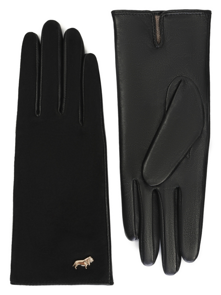 Перчатки из натуральной кожи ягненка. Подкладка: 70% шерсть, 30% акрил. Отделка - лицевая сторона перчатки выполнена из натурального велюра, фирменная фурнитура в виде собачки. Длина манжеты от нижней точки большого пальца до края перчаток - 6 см. Длина пальцев - средняя.