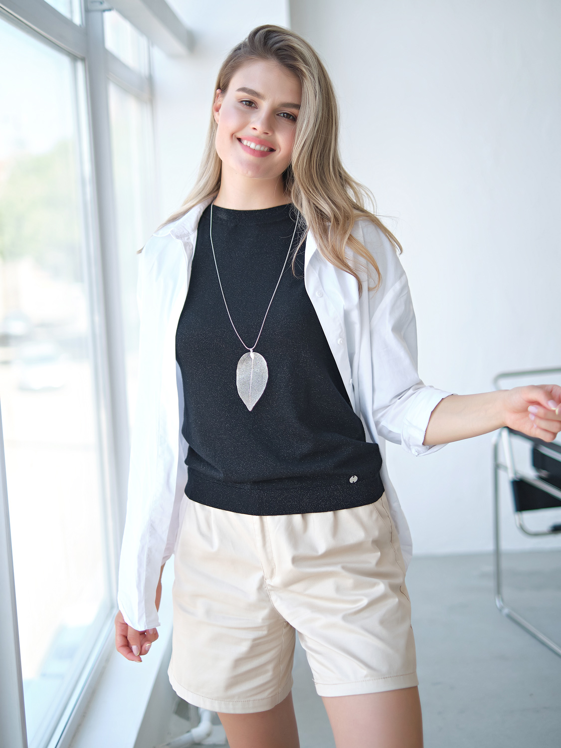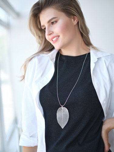 Украшение-подвеска в виде изящного ажурного листа создает утонченный и воздушный образ.