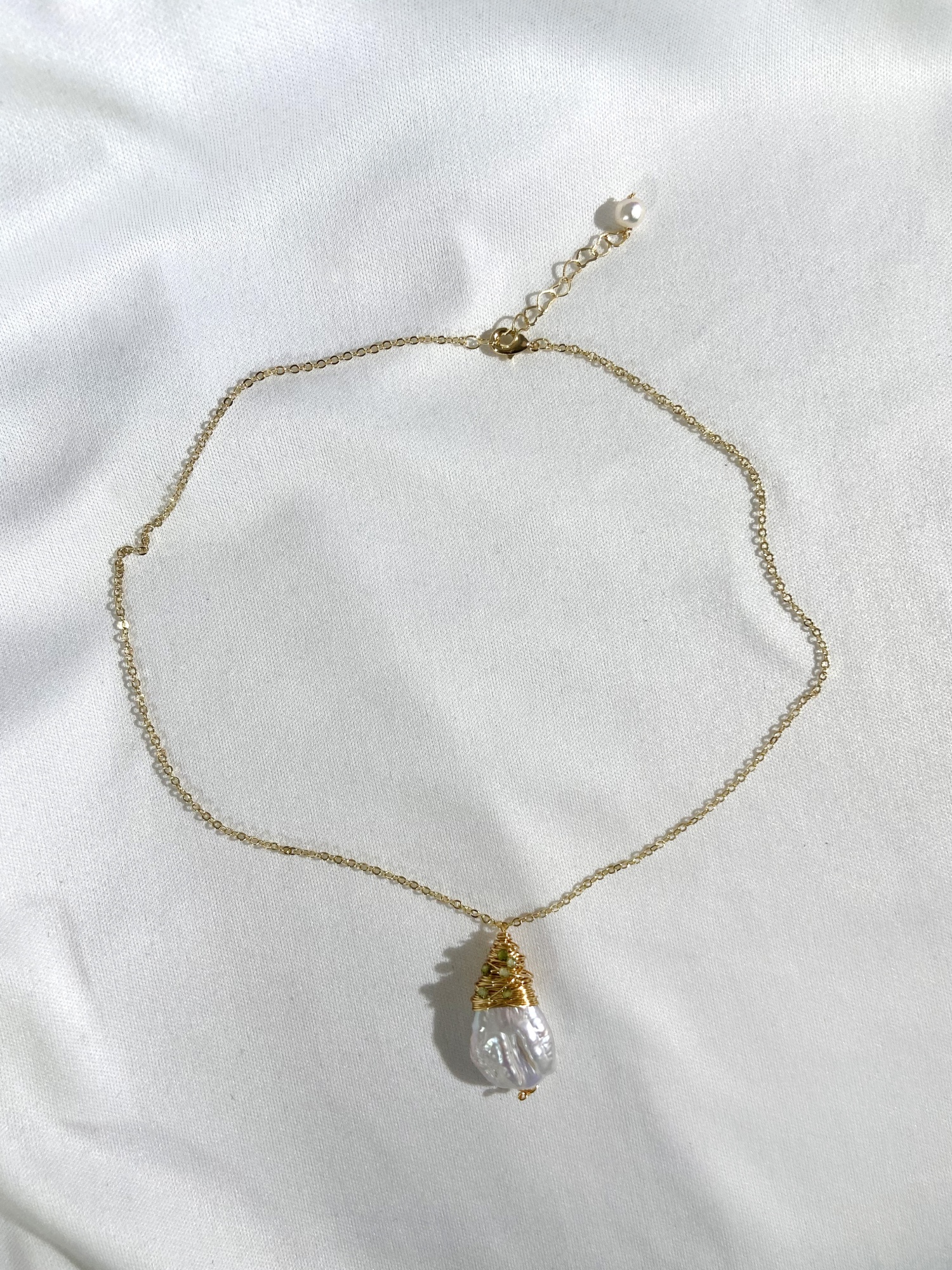 Элегантное колье с золотистой цепочкой и жемчужной подвеской, которое можно регулировать по длине для идеального сочетания с любым нарядом.