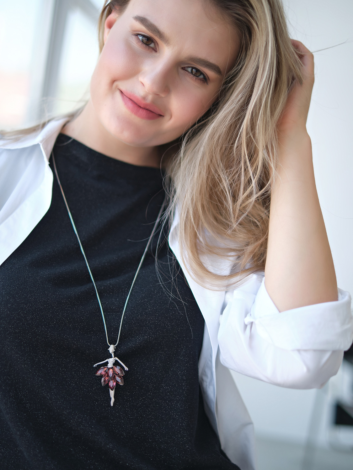 Украшение-подвеска создает изящный и женственный образ. Изделие выполнено из комбинированных материалов с использованием вставок горного хрусталя.