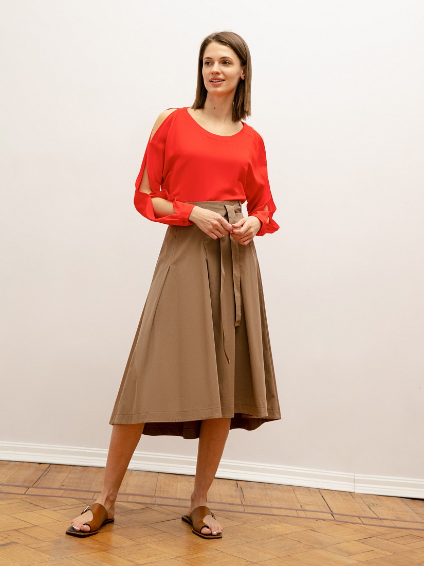 Однотонная расклешенная юбка длины миди. На талии заложены глубокие складки, сзади юбка удлинена. В комплекте идет тканевый пояс из основного материала изделия.