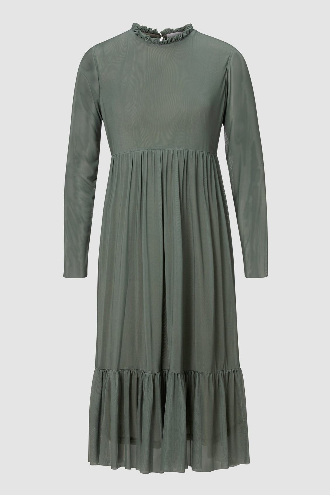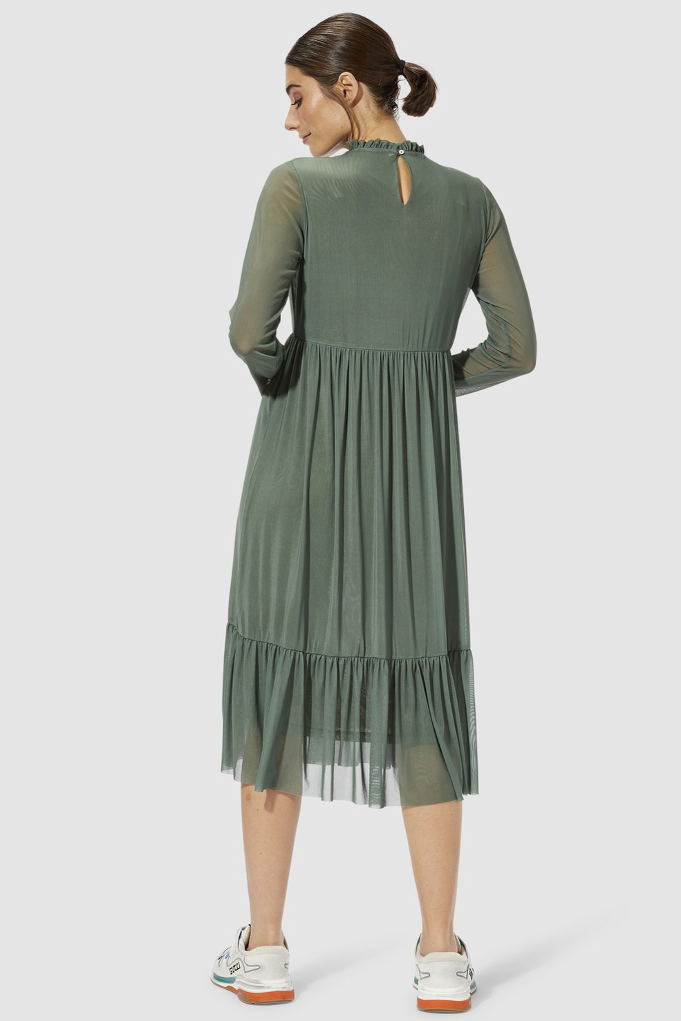 Однотонное платье миди в ретро стиле непринужденно подчеркнет женственность. Воротник-стойка украшен рюшами. Втачной рукав полной длины из полупрозрачного тюля. Волан по краю подола. Сзади вырез-капелька на пуговице.