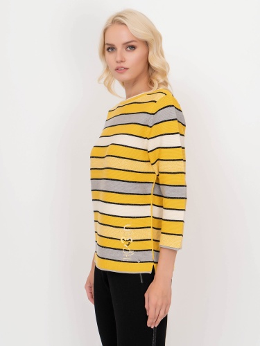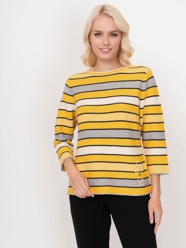 Яркий джемпер обеспечивает отличное настроение в холодное время года. Слегка приталенный силуэт, круглый вырез горловины, втачные рукава 3/4. Полосатый дизайн уверенно держится в тренде, а вплетение нити люрекса придает образу нотку шика. Материал из хлопковой смеси приятен к телу и удобен в ношении.
