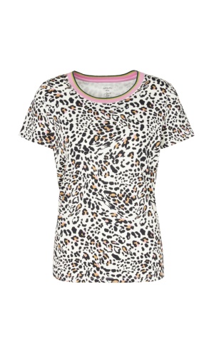 Футболка прямого покроя с анималистическим принтом. Круглый вырез горловины с контрастной обтачкой, короткие втачные рукава. Удлиненная спинка изделия, небольшие разрезы по бокам. Материал из хлопковой смеси приятен к телу и обеспечивает комфорт.