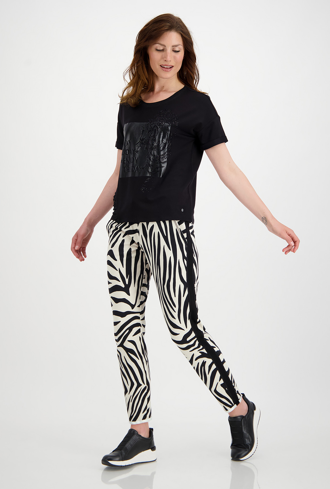 Однотонная футболка свободного силуэта – комфортный вариант для повседневного образа. Широкая круглая горловина. Втачной короткий рукав, спущенная линия плеча. Анималистичный принт в тон футболки.