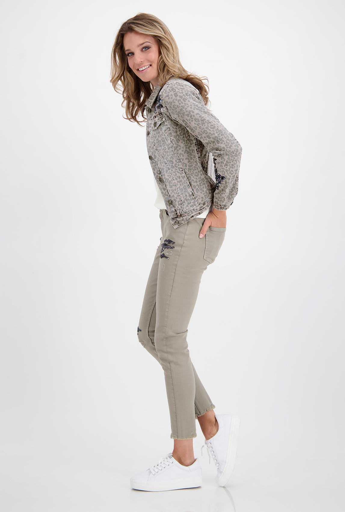 Оригинальная джинсовка с накладными карманами и анималистичным принтом. Эффект запыленности делает джинсовку трендовой. Пайетки создают яркие акценты. Джинсовка застегивается на пуговицы, имеет втачной рукав полной длины.