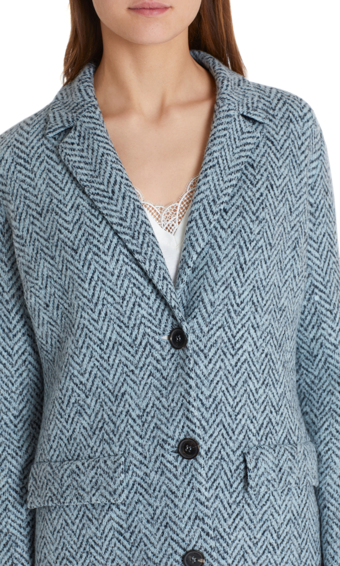 Летнее пальто. Английский воротник, втачной рукав полной длины. Застежка на пуговицы. Отделка бахромой по низу изделия и рукавов.