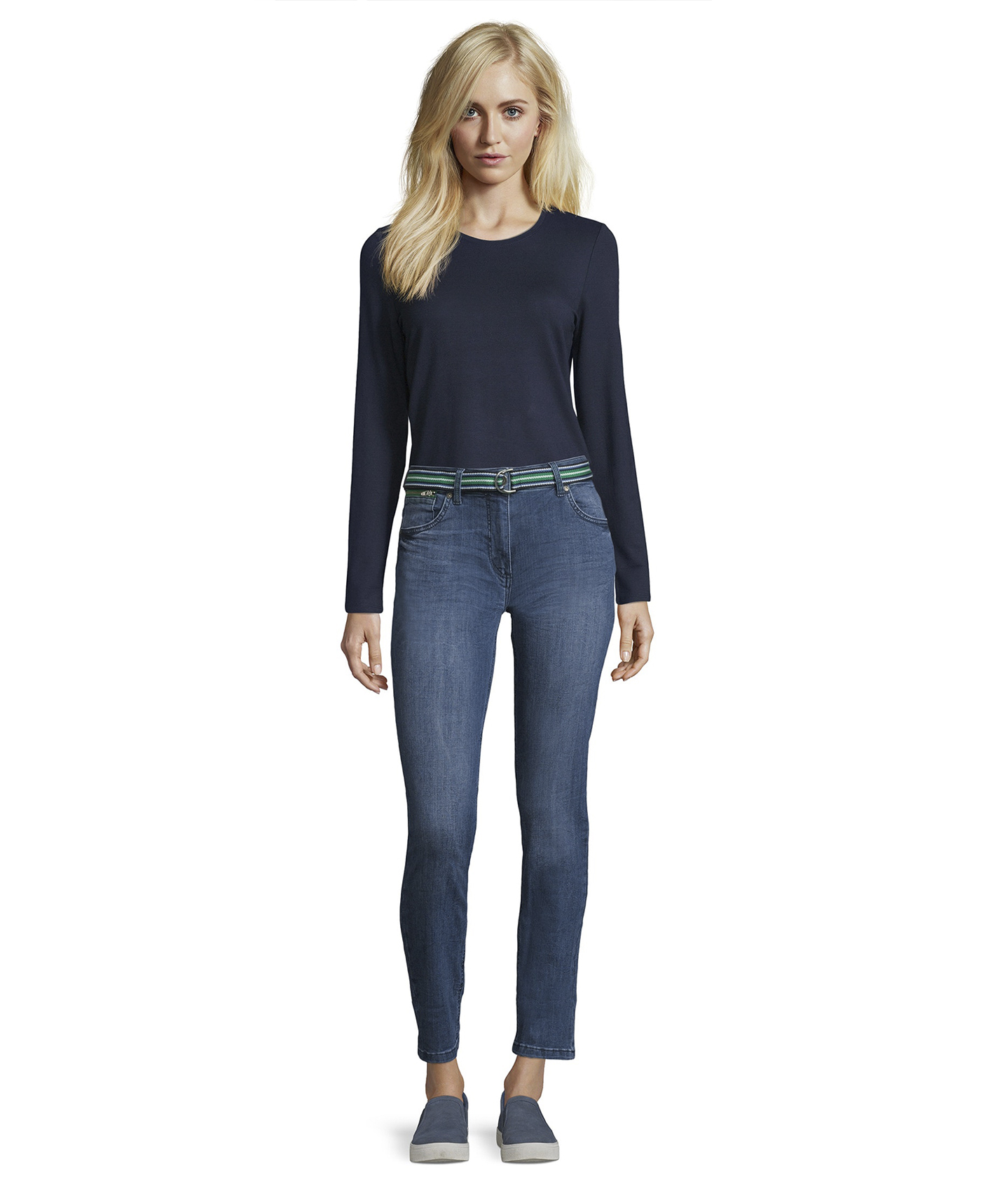 Джинсы силуэта slim подчеркивают стройные ноги. Классическая средняя посадка. Стильные джинсовые потертости. Материал из хлопковой смеси приятен к телу и обеспечивает комфорт. Эти джинсы - изюминка стиля кэжуал, в комплекте с ними можно создать множество современных образов.