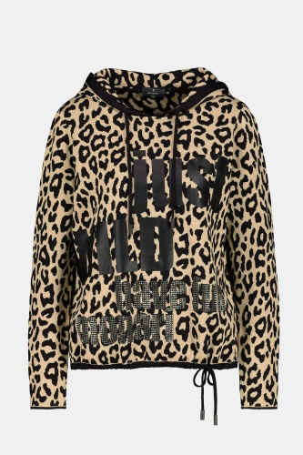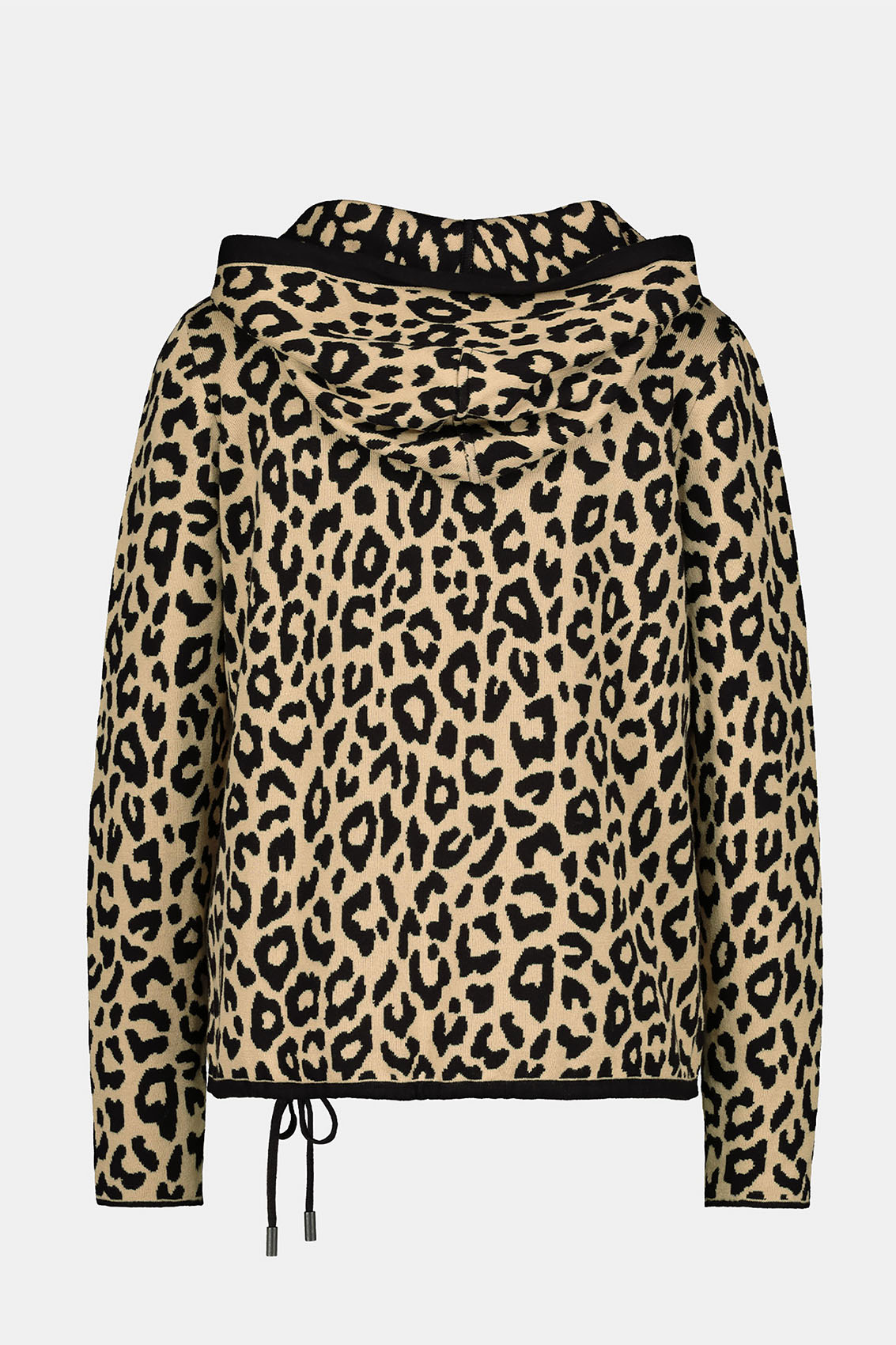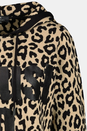 Яркий джемпер в анималистичном принте. Капюшон на кулиске. Также кулиска по низу изделия. Втачной рукав полной длины. Принт на переде изделия украшен стразами.