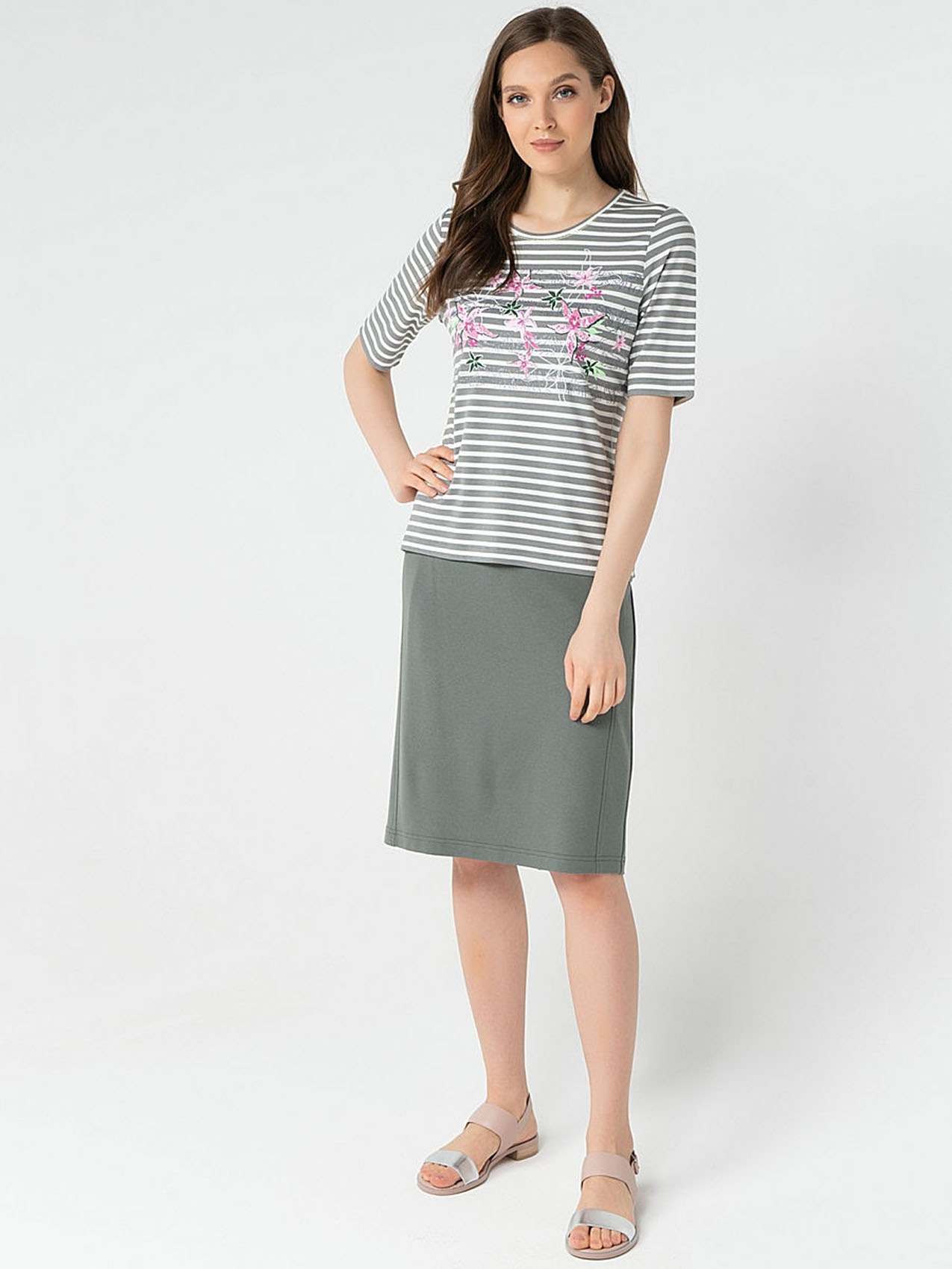 Полоска и тропические цветы - отличное сочетание трендовых мотивов! Приятный к телу материал из смеси вискозы и эластана гарантирует отличную посадку, а рукав 1/2 придает образу легкость и непринужденность. Футболка будет замечательным компаньоном как в брючном, так и в юбочном комплекте.