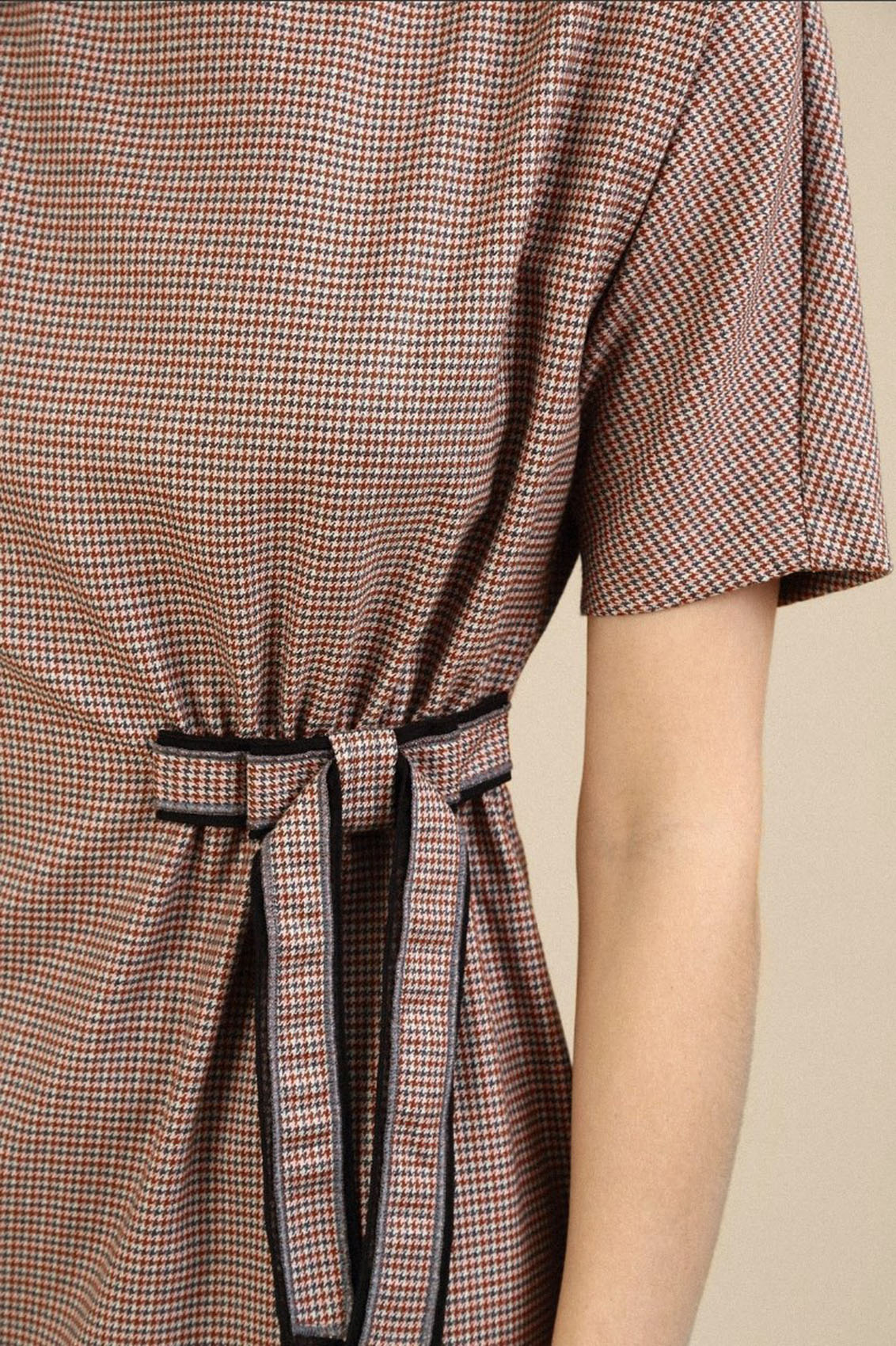 Платье с орнаментом "гусиная лапка" в коричнево-серой цветовой гамме. Модель без подкладки, имеет полуприталенный силуэт, круглый вырез горловины, короткие цельнокроеные рукава, вертикальные вытачки на спине. Украшением служит асимметрично расположенный притачной декоративный элемент в форме банта с контрастной черной окантовкой, формирующий мягкие складки в районе линии талии.