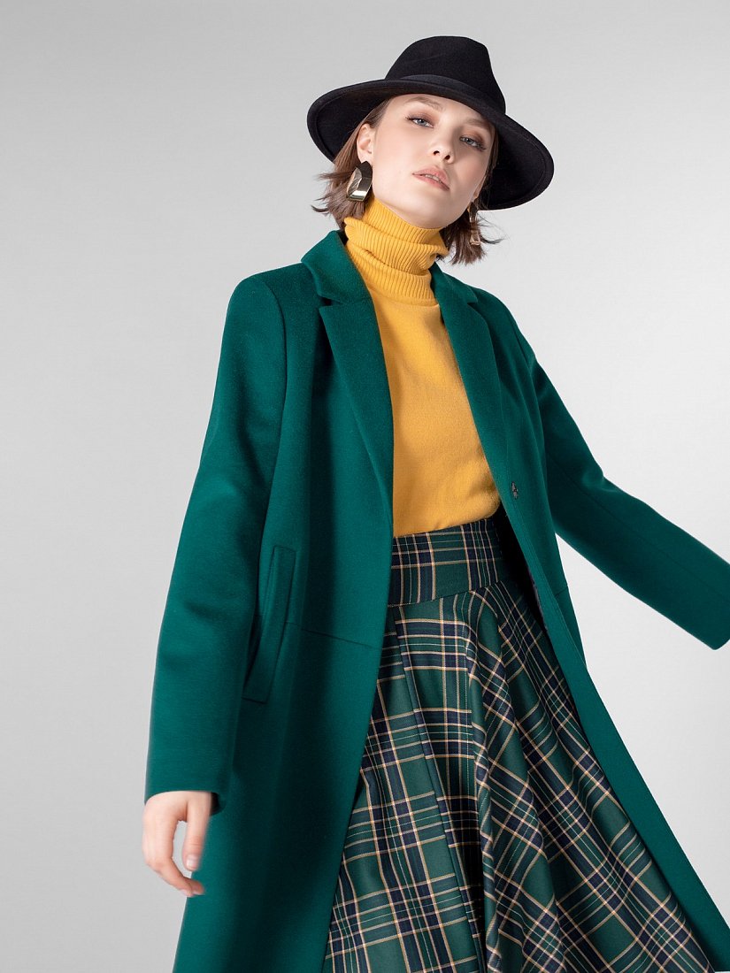 Пальто прямого силуэта длиной выше колена. Втачной рукав, застёжка на пришивные кнопки, английский воротник, горизонтальный подрез на полочке и спинке, вертикальные карманы-листочки. Ветрозащитная мембрана Raft Pro. Изготовлено из ворсовой шерстяной ткани изумрудного цвета.