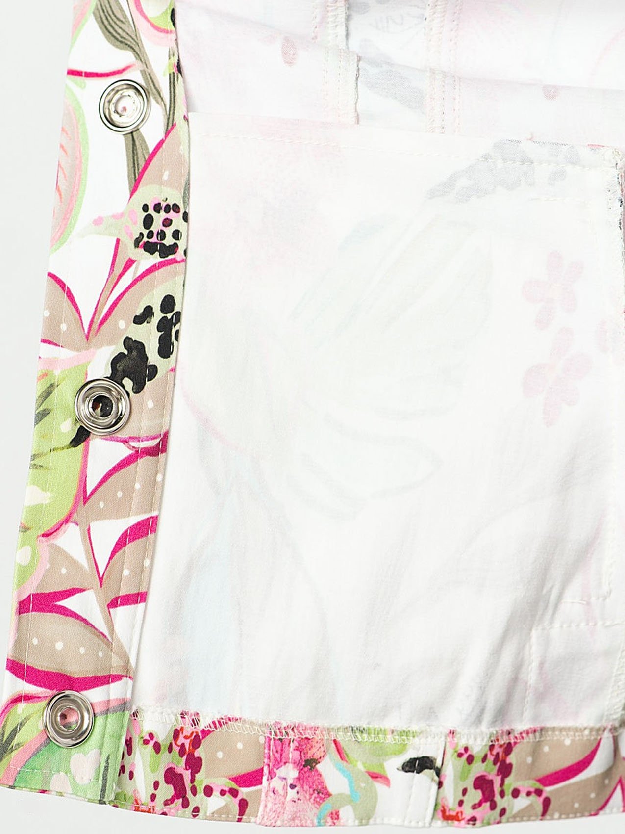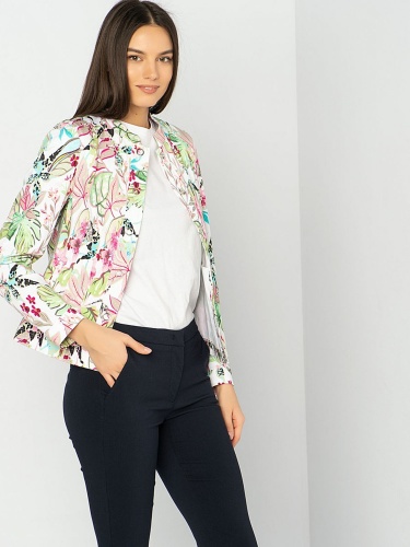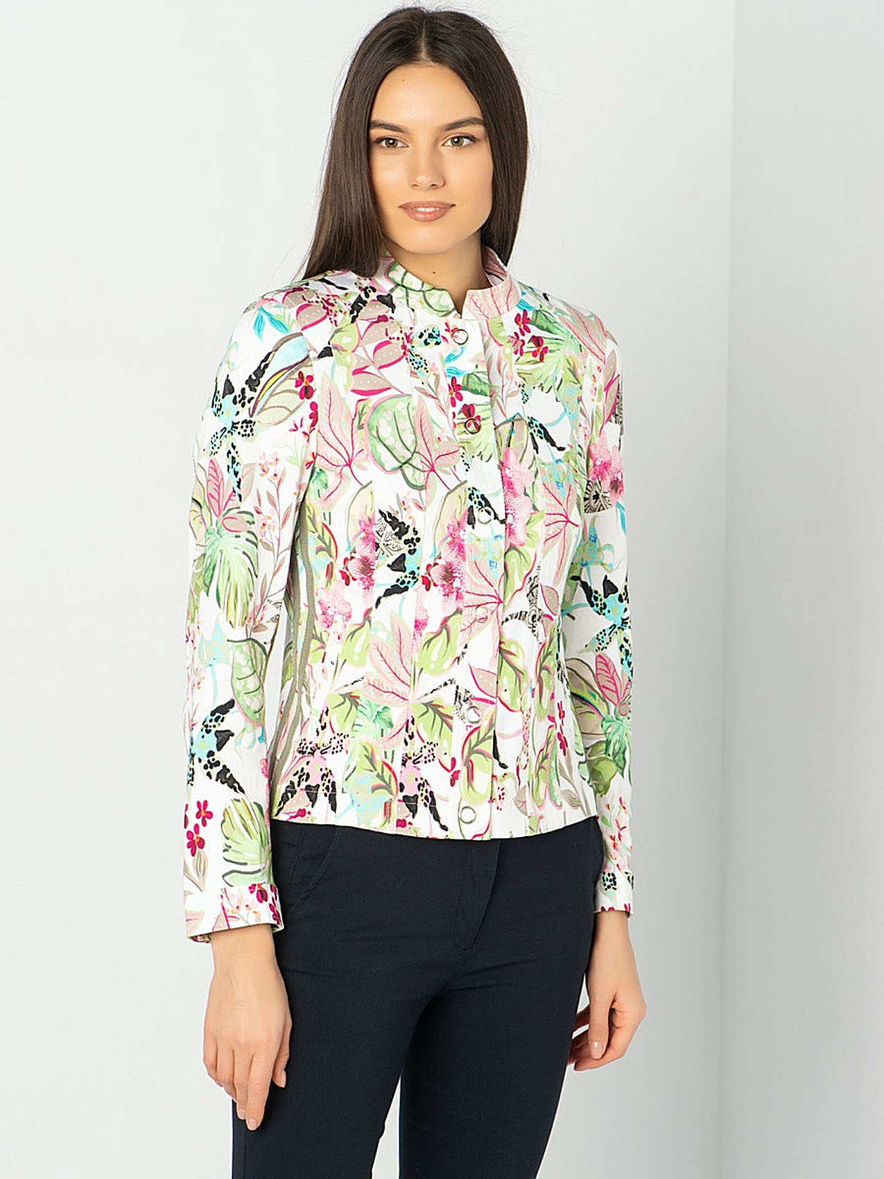 Светлый жакет с цветочным принтом создает весеннее настроение, так что даже в хмурый день ваша улыбка будет сиять. Хлопковый материал с примесью эластана обеспечивает комфорт и отличную посадку. Слегка приталенный силуэт, воротник-стойка и кнопки - то, что нужно для отличного дизайна. Эта модель удачно сочетается как с брюками, так и с юбкой. Свежие цвета сделают ваш образ ярким!
