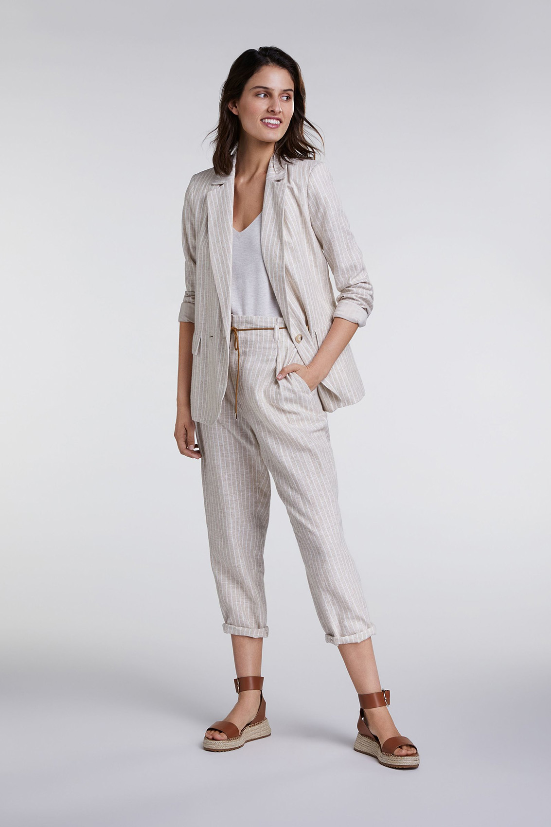 Жакет прямого покроя обязательно должен быть в каждом гардеробе! Отложной воротник с лацканами, застежка на пуговицах. Трендовый принт в полоску. Материал из смеси хлопка и льна приятен к телу и обеспечивает комфорт. Эта модель универсальна и может служить основой как для делового, так и для повседневного образа.