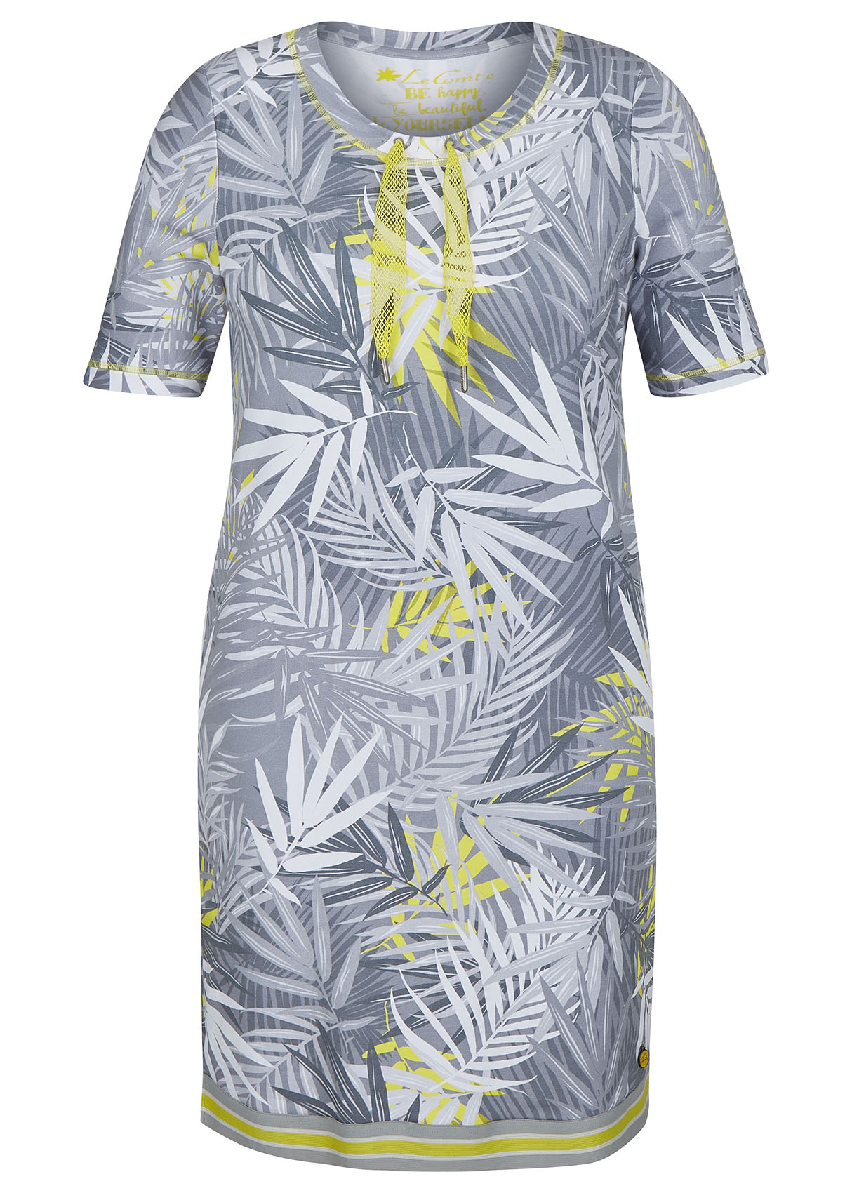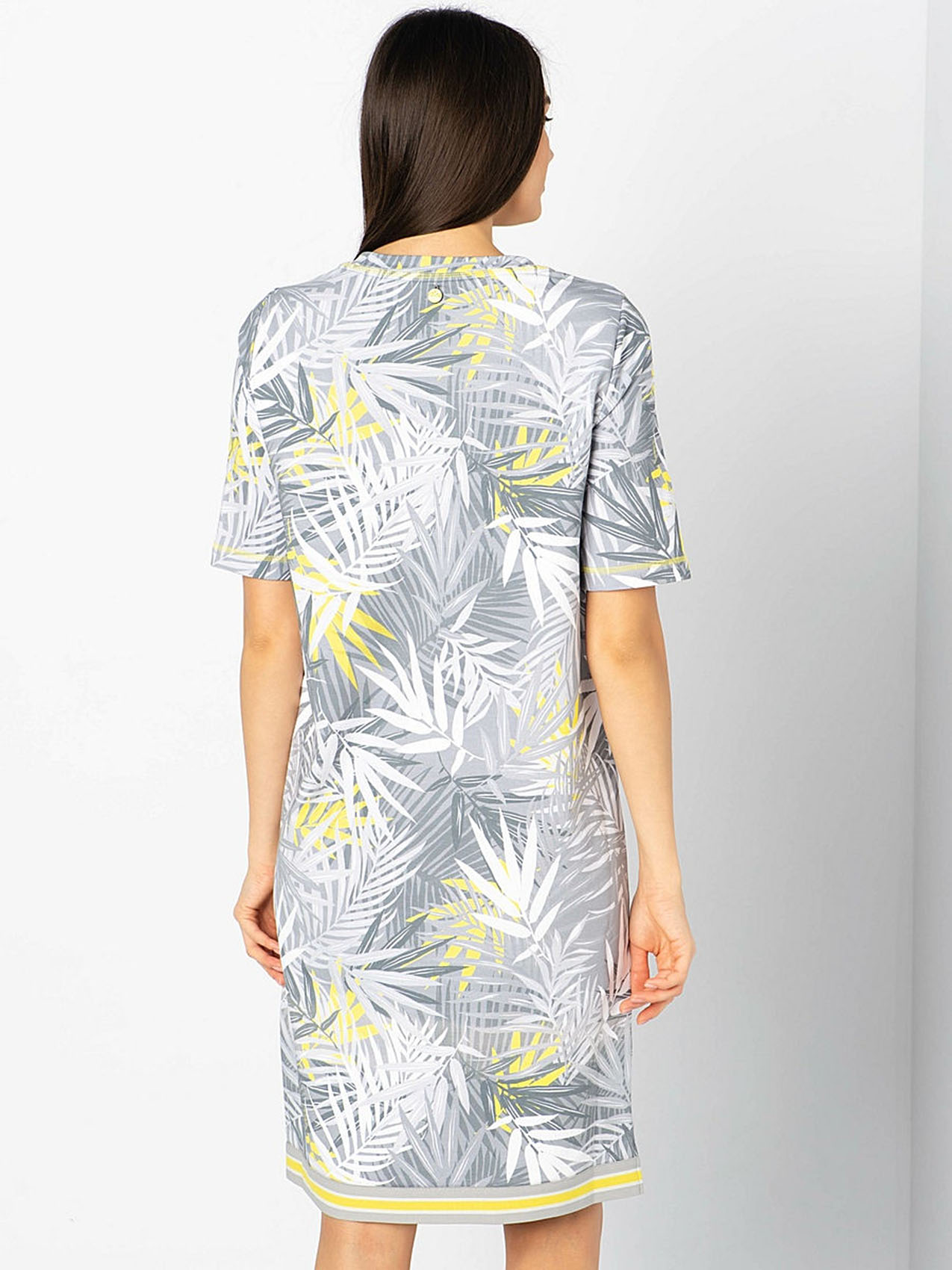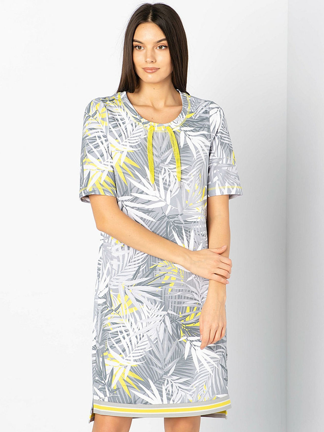 Платье миди. Круглый вырез горловины с желтыми завязками. Рукав 1/2. Удлиненная спинка, небольшие разрезы по бокам, отделка по низу изделия. Принт с тропическими мотивами, яркие цветовые акценты. Приятный к телу материал из смеси хлопка и эластана.