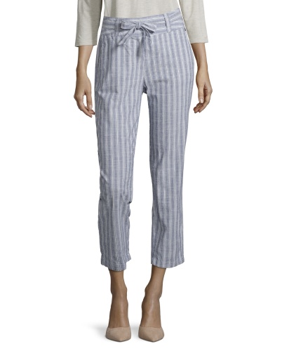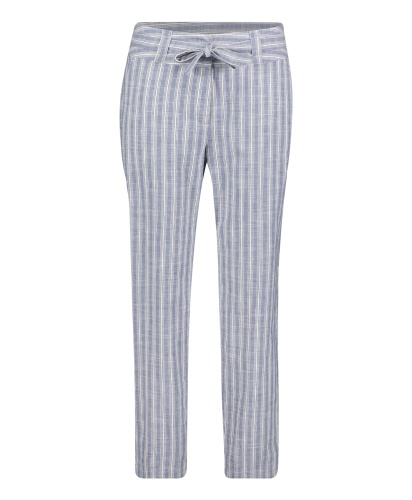 Брюки прямого кроя. Полосатый принт визуально удлиняет ноги. Длина 7/8 позволяет подчеркнуть модную обувь. Элегантная деталь модели - пояс-бант. Приятный к телу материал из смеси хлопка и льна обеспечивает комфорт в ношении. Эти брюки гарантируют трендовый образ в сочетании с любым верхом и обувью.