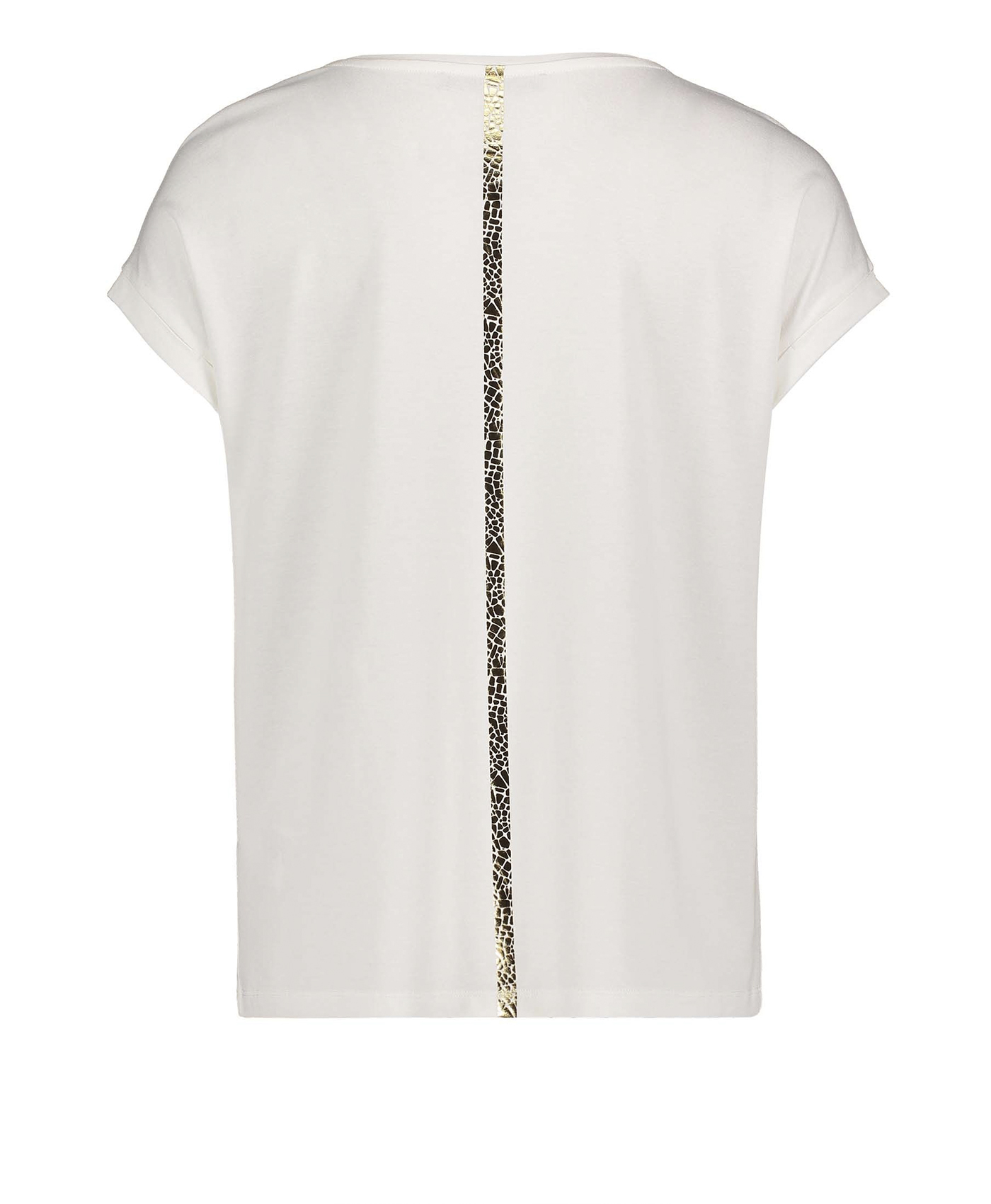 Топ с абстрактным принтом создает яркий образ. Прямой покрой, круглый вырез горловины, короткие рукава с фиксированными манжетами. Спинка изделия выполнена из однотонного материала с металлизированным принтом. Приятный к телу материал из вискозной смеси обеспечивает комфорт. Этот топ прекрасно смотрится в любом комплекте одежды.