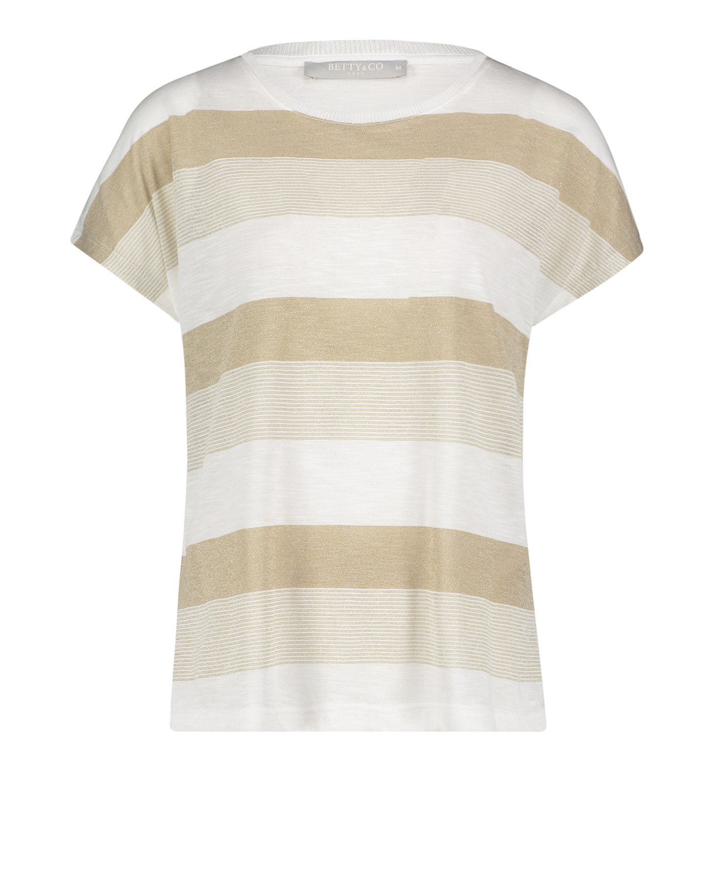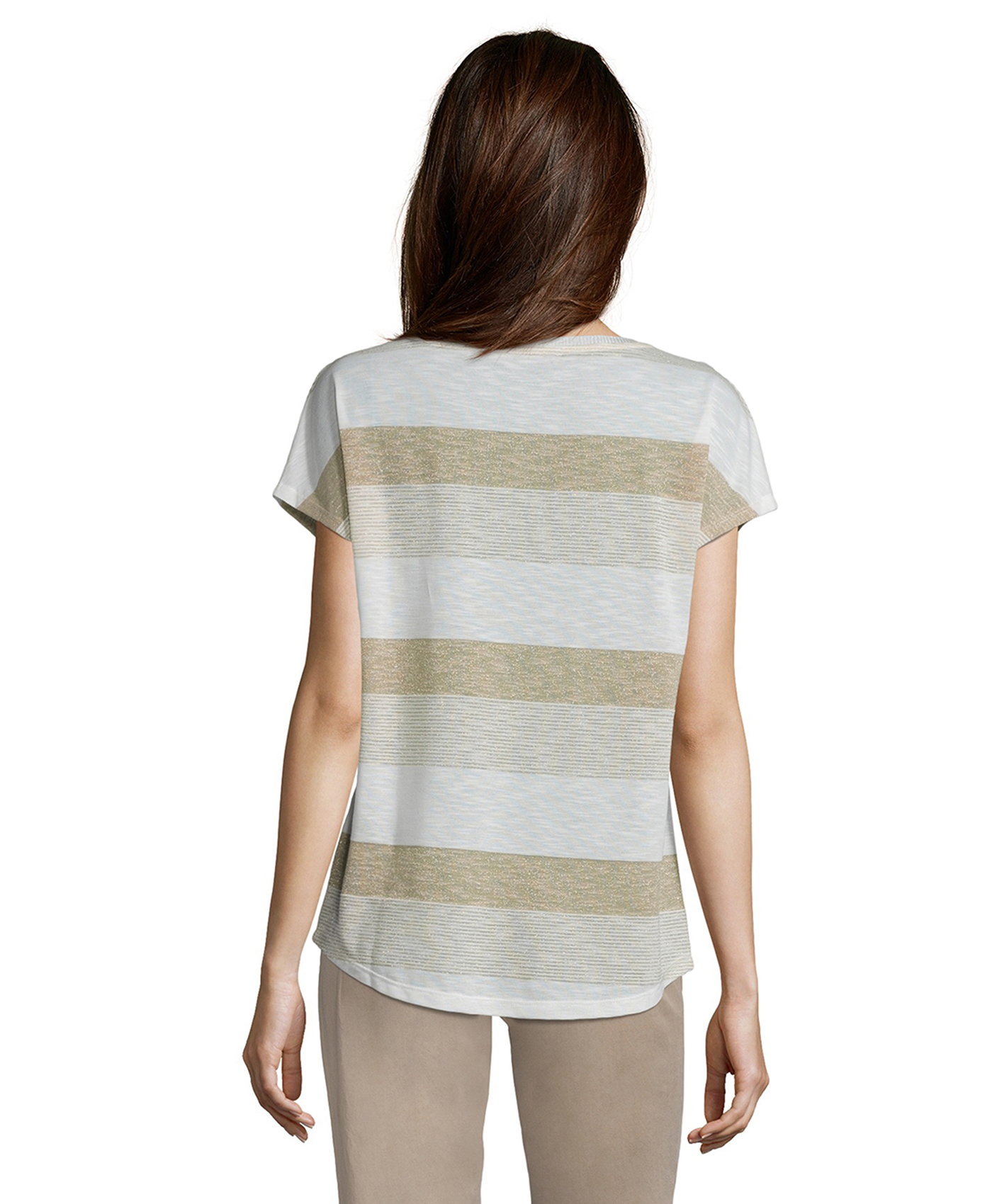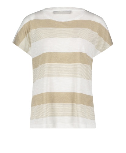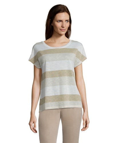 Футболка слегка приталенного силуэта. Широкий круглый вырез горловины, короткие цельнокроеные рукава. Трендовая полоска с вплетением нити люрекса. Эта простая модель - отличный компаньон в любом комплекте одежды.
