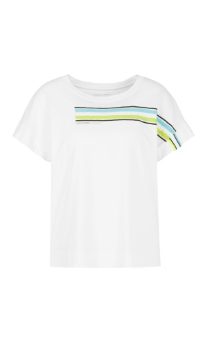 Футболка прямого кроя. Круглый вырез горловины, короткие рукава. Принт полоска. Хлопковый материал приятен к телу и обеспечивает комфорт.