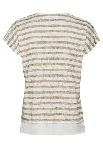 Стильная футболка Julie. Лицевая сторона украшена женственным цветочным принтом и надписью из страз. Принт в полоску на спинке изделия. Широкий низ футболки с боковыми разрезами. U-образный вырез, цельнокроеный рукав придают образу свободу и непринужденный вид. Абсолютная модная вещь для модных образов! • цветочный принт с надписью, стразы • приятный к телу материал с вискозой в составе • однотонный низ, цельнокроеный рукав • U-образный вырез, слегка приталенный силуэт • длина около 64 см
