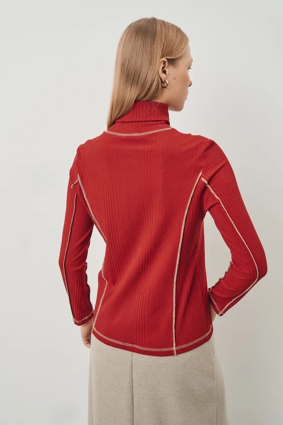 Блуза полуприлегающего силуэта из трикотажного полотна. Воротник стойка. Выполнена из кроеного трикотажа, в составе шерсть и вискоза. Швы отделаны контрастной нитью наружу