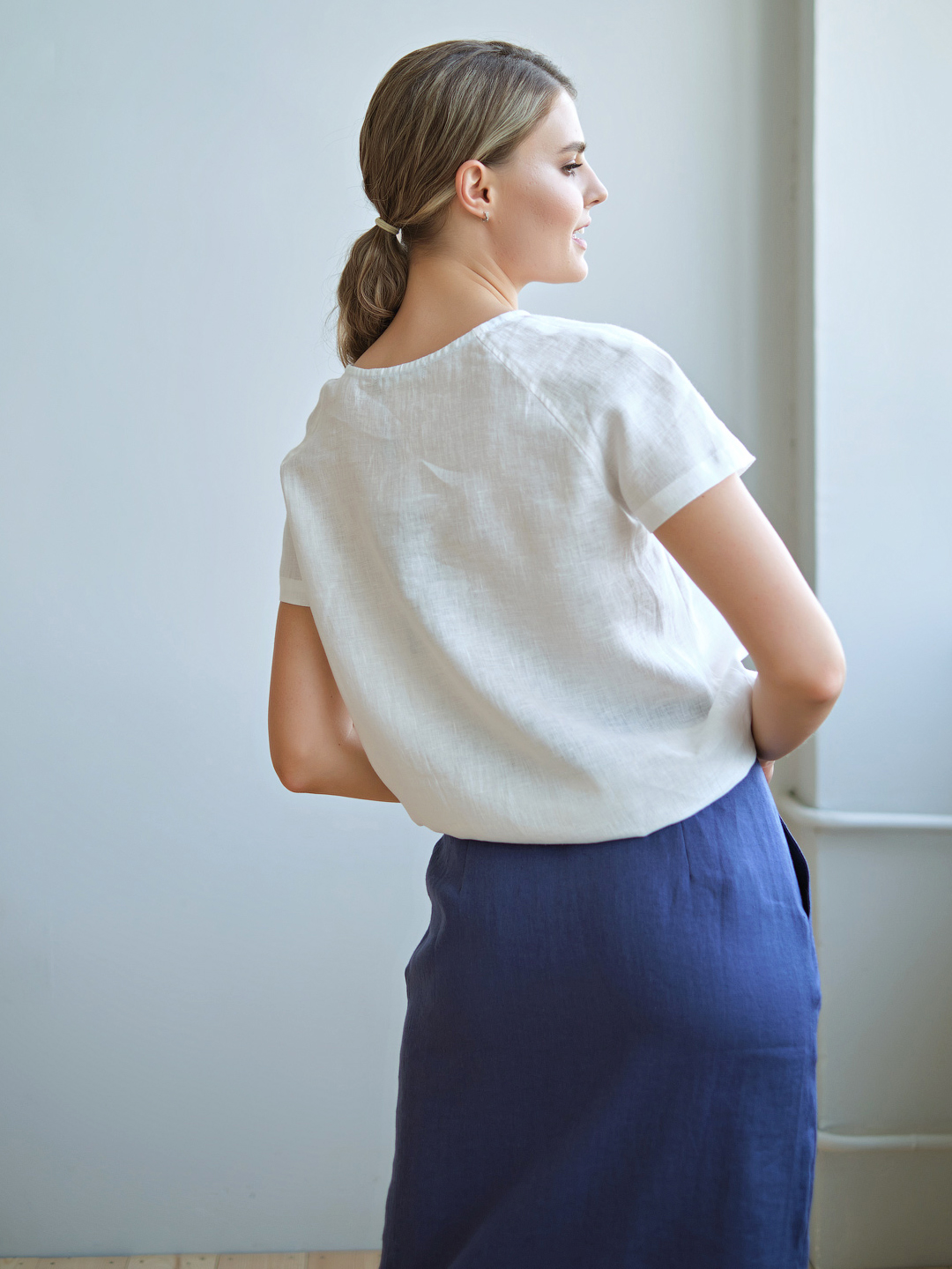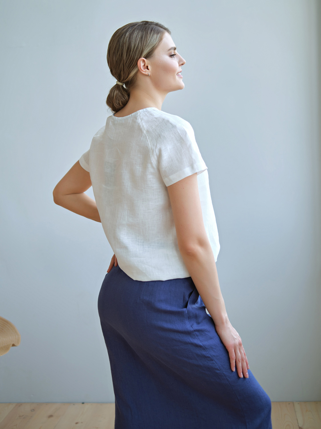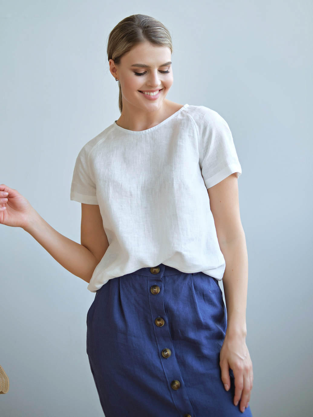 На сайте указаны российские размеры. Блузка из 100-го льна идеально подойдет для жаркой летней погоды. Лен приятен к телу, позволяет коже дышать и обеспечивает правильную терморегуляцию. Свободный силуэт подчеркивает достоинства и скрывает недостатки фигуры. Короткий рукав-реглан позволяет оголить руки и сделать образ легким. Овальный вырез горловины подчеркивает изящество линии шеи. По низу изделия эластичная резинка. Данную модель можно носить, заправляя в юбку, шорты или брюки, либо навыпуск. Ткань: Легкая блузка выполнена из 100% льна – максимально комфортного для носки материала. Имеет благородную полупрозрачную фактуру, при этом не просвечивает, благодаря чему может быть использована даже в деловом стиле. Крой: Свободный силуэт позволяет добиться непревзойденного комфорта при движении. Базовая модель с круглым вырезом и удобным коротким рукавом, как у футболки, легко вписывается в любой гардероб и подходит под разные стили. Отделка: аккуратная резинка по низу изделия.
