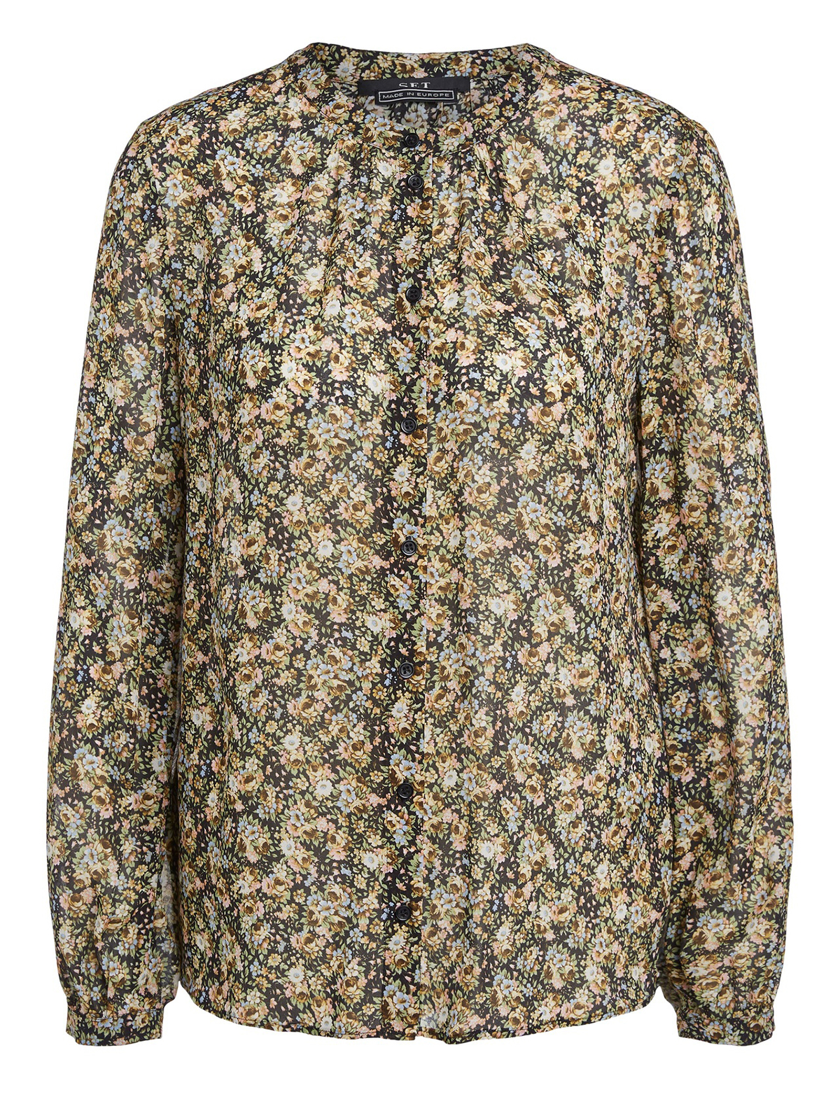 Блузка с красивым узором в стиле кэжуал. 100% экологически чистый вискозный шифон. Цветочный принт по всей поверхности. Круглый вырез и планка на потайных пуговицах. Полупрозрачный материал. Длина 42 российского размера: 64 см.