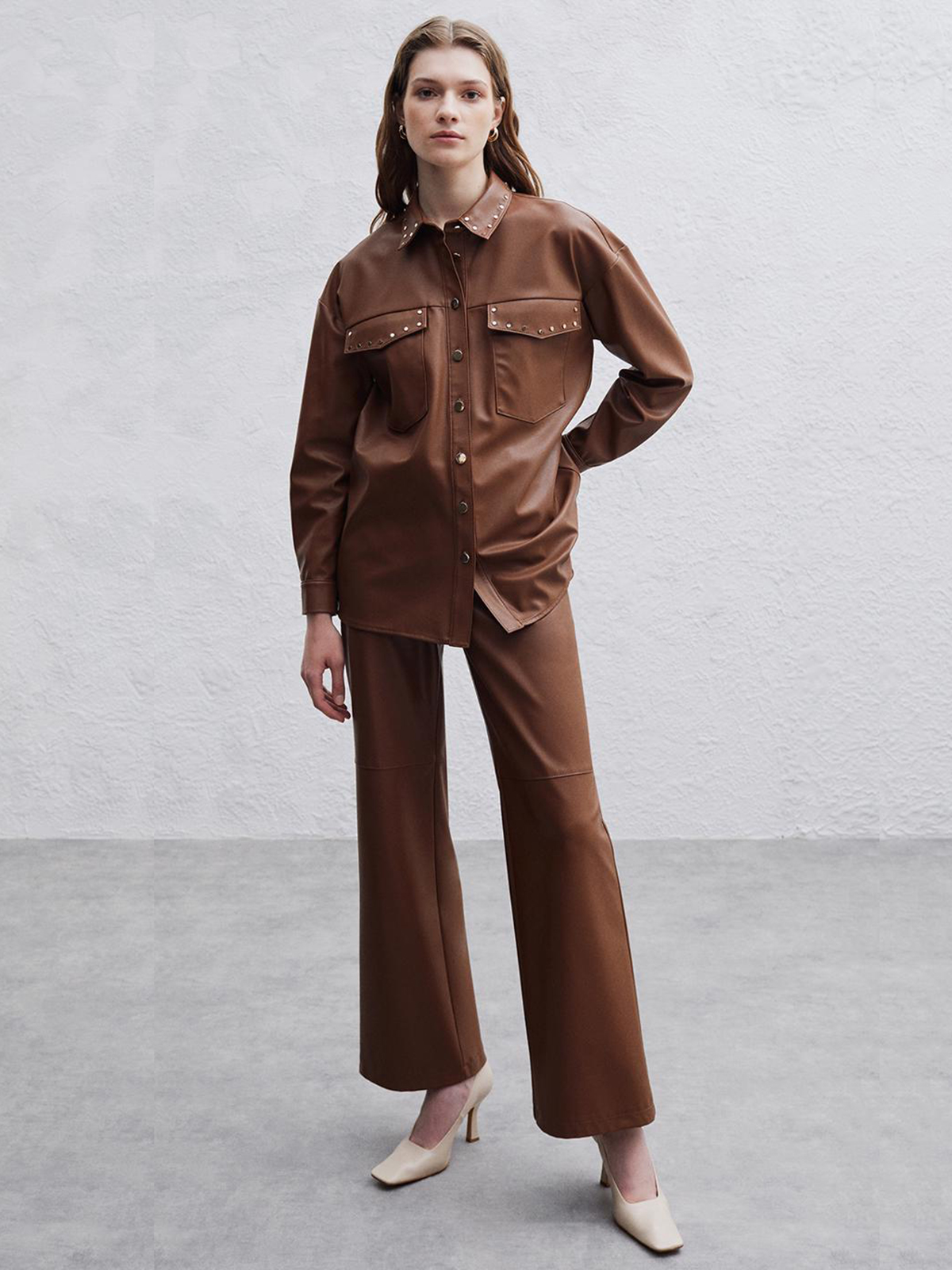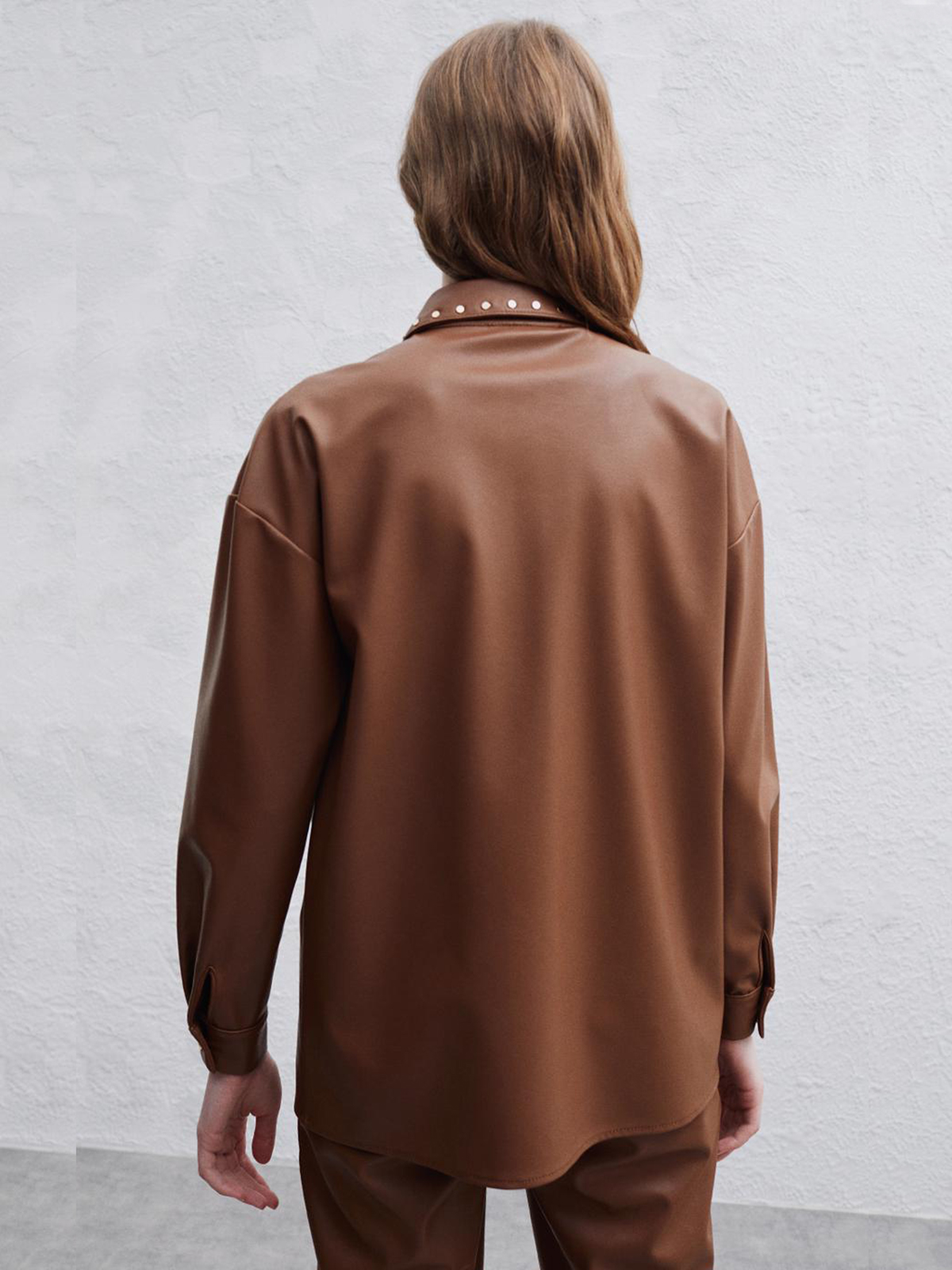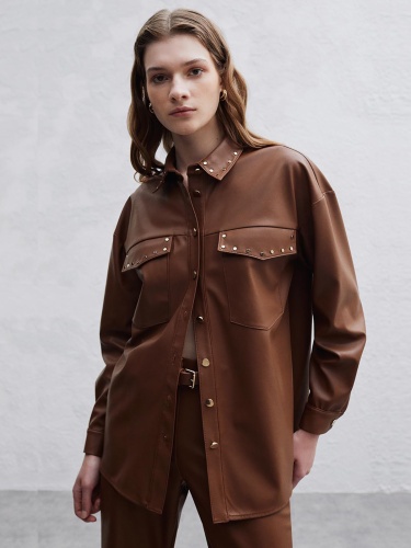 Рубашка из экокожи коричневого цвета. Прямой крой, отложной рубашечный воротник, застежка на пуговицы золотого цвета. Длинный втачной рукав с манжетой, спущенная линия плеч.
