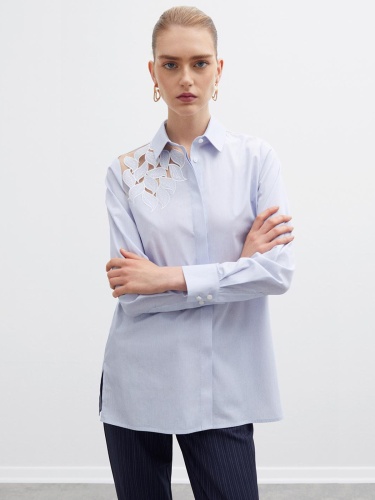 Однотонная рубашка прямого кроя с оригинальным растительным элементом на плече. Отложной рубашечный воротник, супатная застежка на пуговицы. Длинный втачной рукав с манжетами.