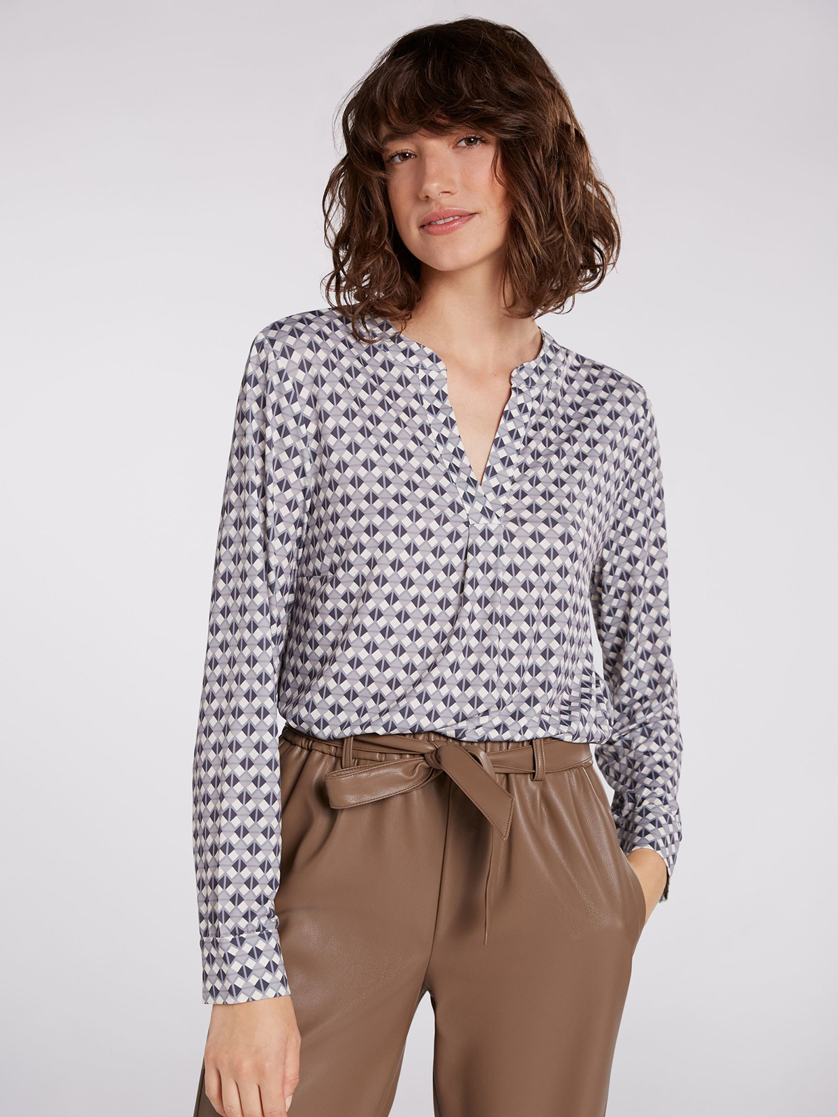 Блуза с оригинальным геометрическим узором по всей поверхности изделия. V-образный вырез горловины, длинные втачные рукава с манжетами на пуговицах.