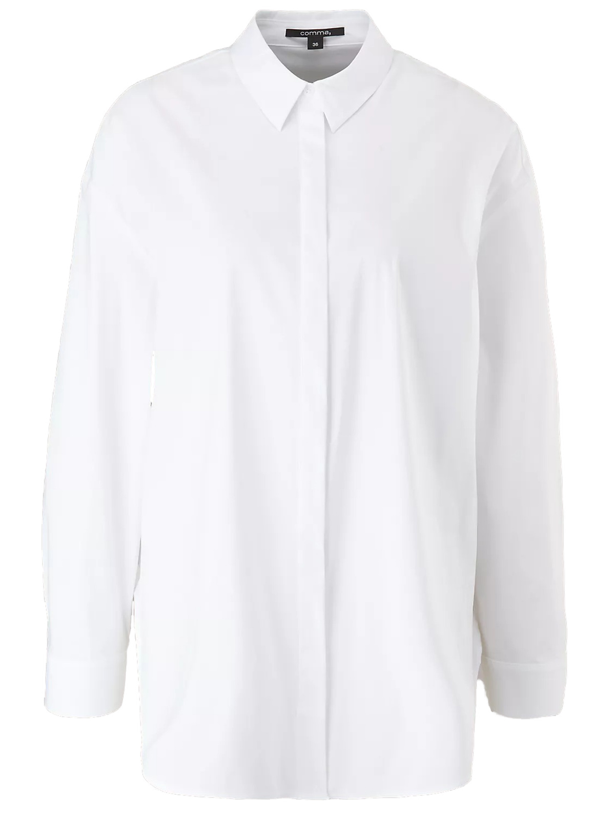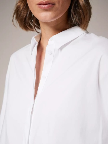 Белая классическая рубашка прямого кроя. Материал из смесового хлопка приятен к телу. Отложной рубашечный воротник, планка с пуговицами, длинный втачной рукав с широкой манжетой.