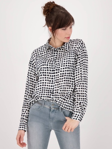 Блуза в монохромном дизайне с абстрактным узором по всей поверхности изделия. Прямой крой, материал из 100% вискозы. Отложной рубашечный воротник, планка с пуговицами в тон. Длинные втачные рукава с манжетами.
