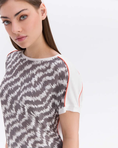 Блузка с анималистическим принтом на полочке и яркой полоской на спинке. Выполнена из эластичного материала на основе вискозы. Прямой крой. Короткий цельнокроеный рукав .