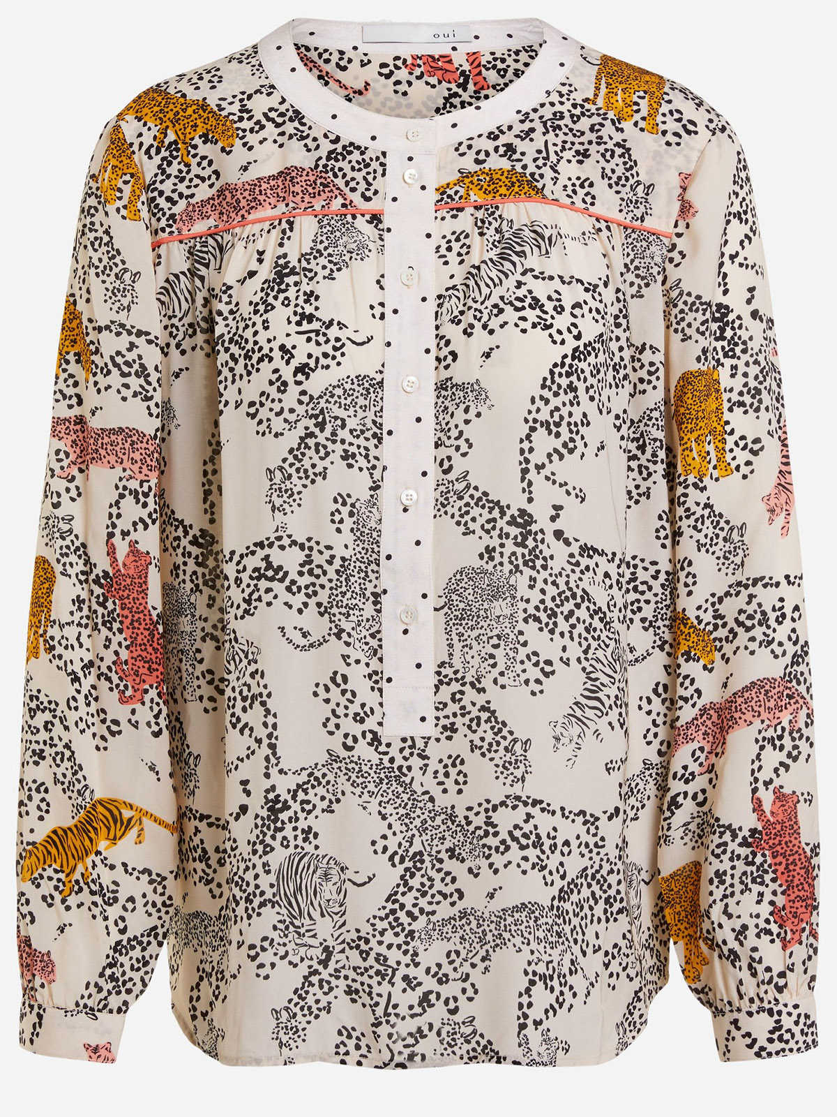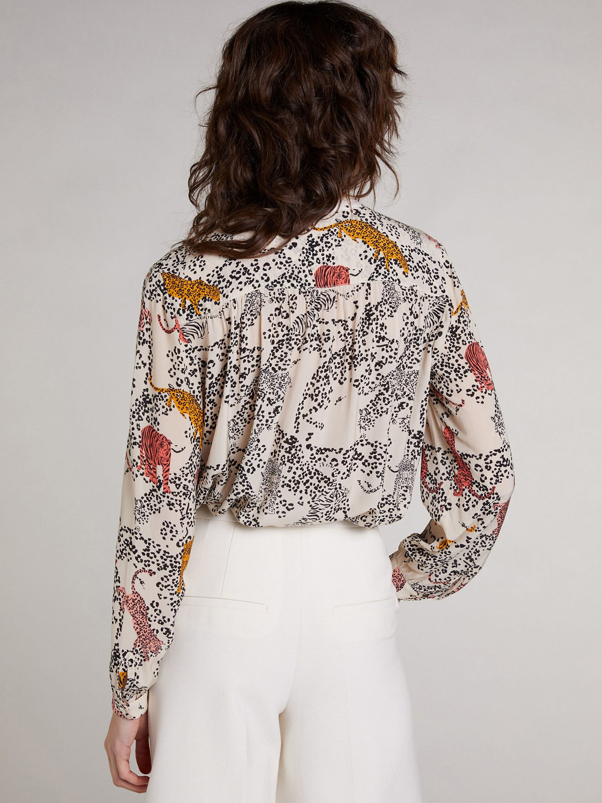 Блуза с анималистичным узором по всей поверхности материала. Планка с пуговицами и воротник с точечным рисунком. Втачной рукав полной длины с манжетой на одну пуговицу. Скругленный низ изделия.