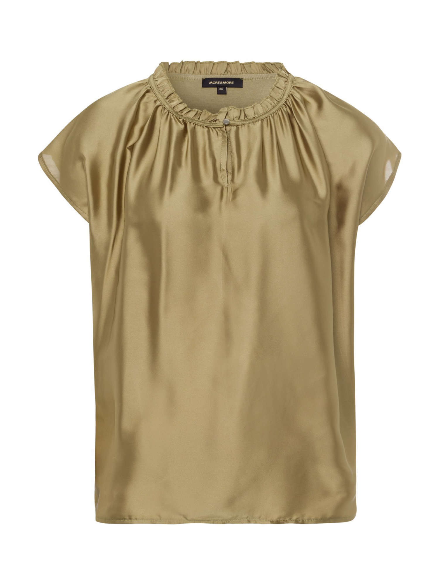Женственная блузка-рубашка с блестящей атласной передней частью и мягкой трикотажной спинкой. -прямой крой -короткий рукав -небольшая оборка на круглом вырезе горловины -вырез и пуговица спереди -длина по размеру 42 = 62 см
