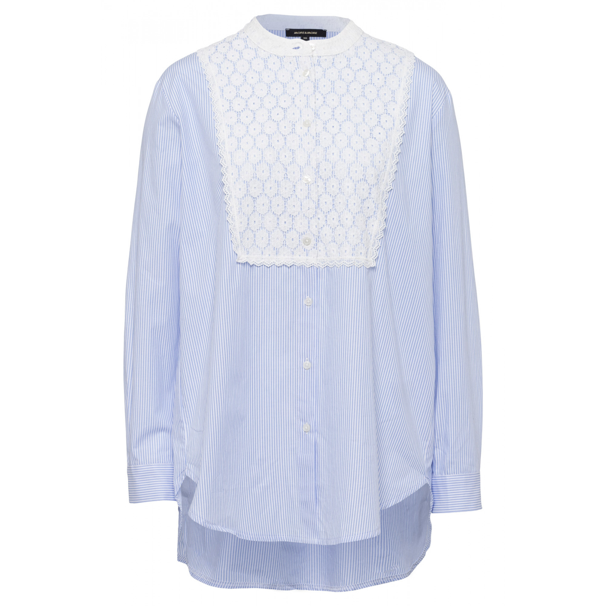 Бело-голубая блуза в полоску с небольшим воротником-стойкой и кружевной отделкой. Длинные рукава с манжетами на пуговицах. Низ модели скругленный, удлиненный сзади. Длина в размере 44 = 78см
