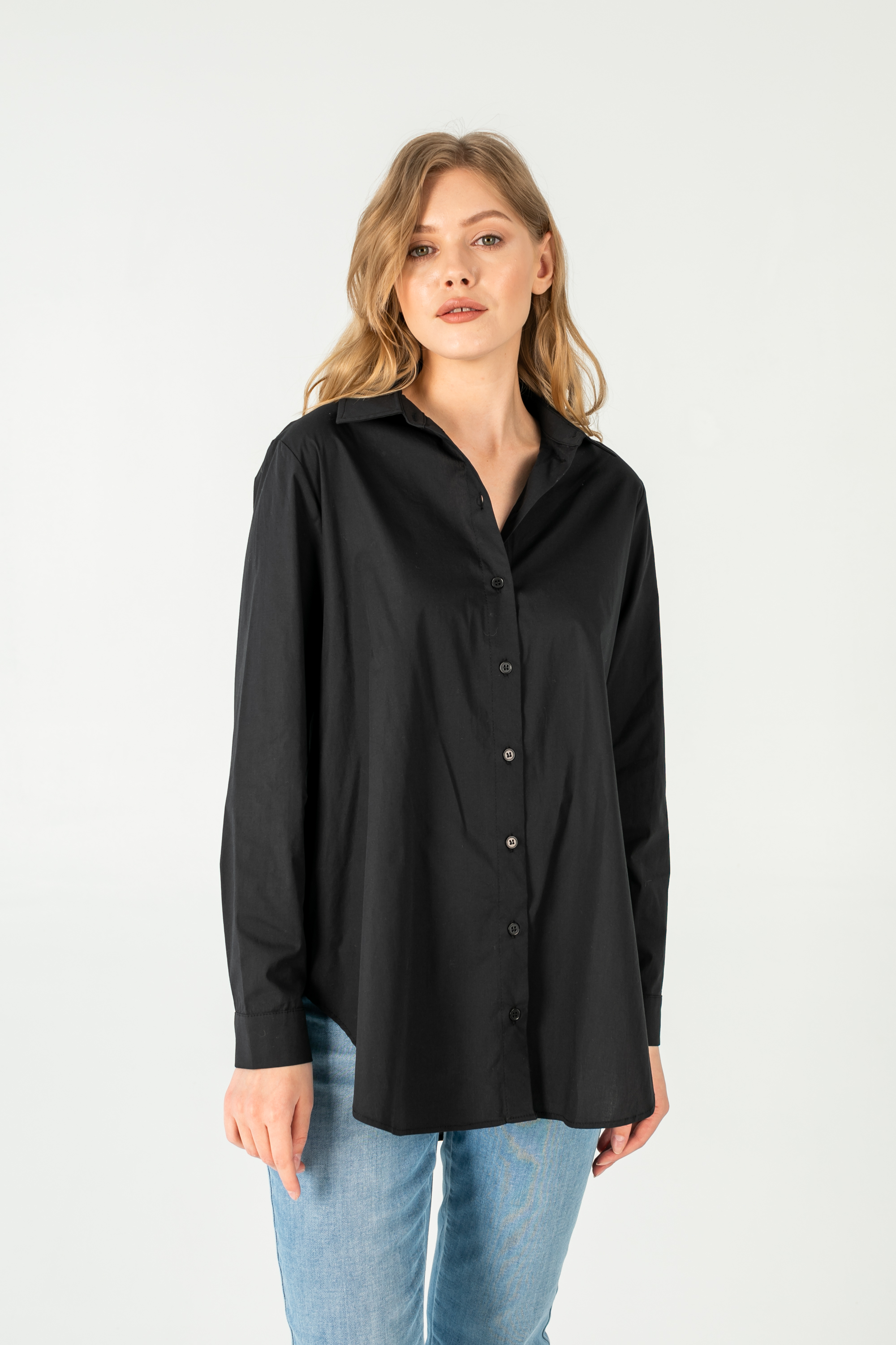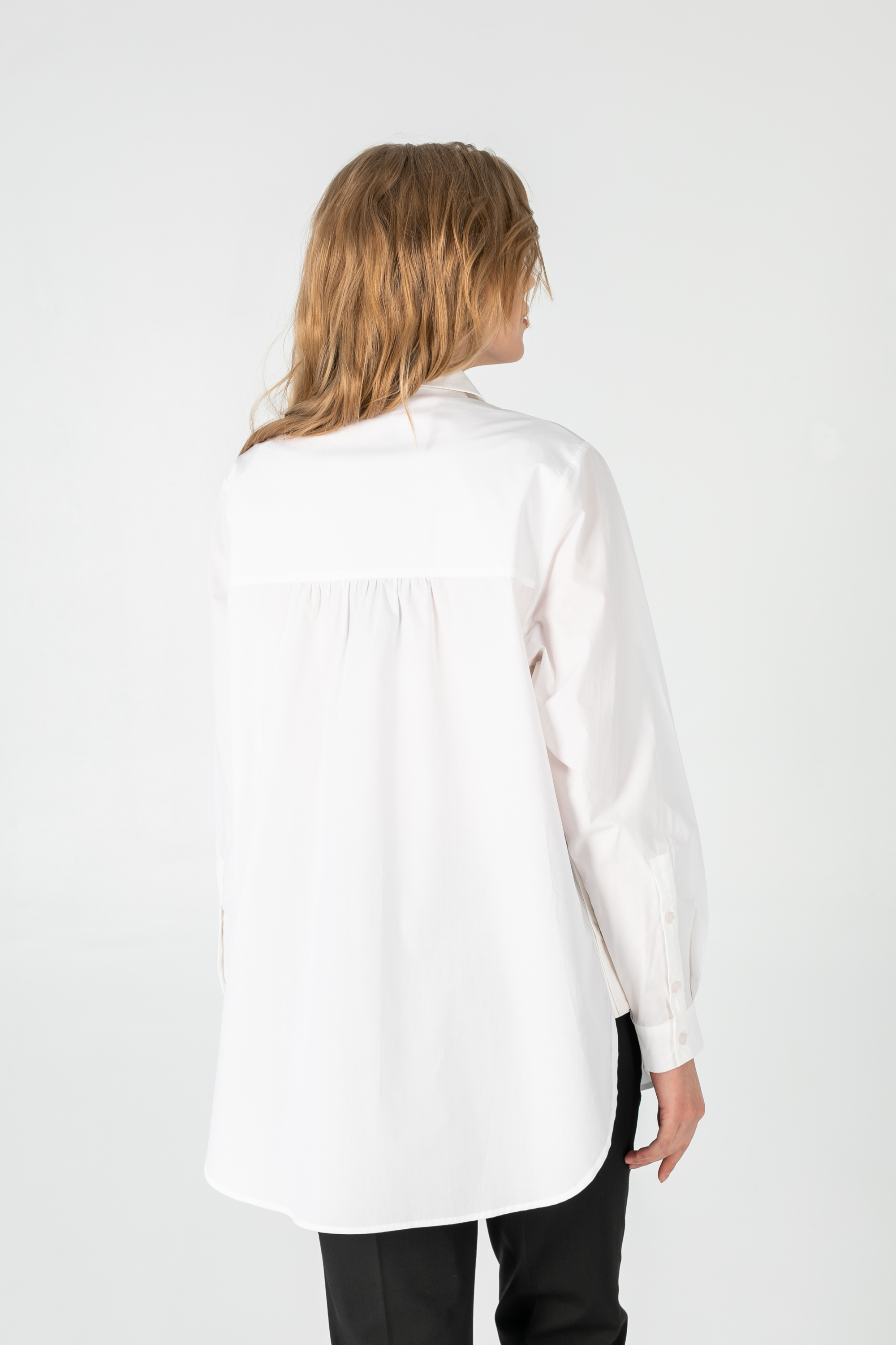 Классическая рубашка в 2-х цветах в стиле оверсайз с удлинением и декоративным элементом на спине.