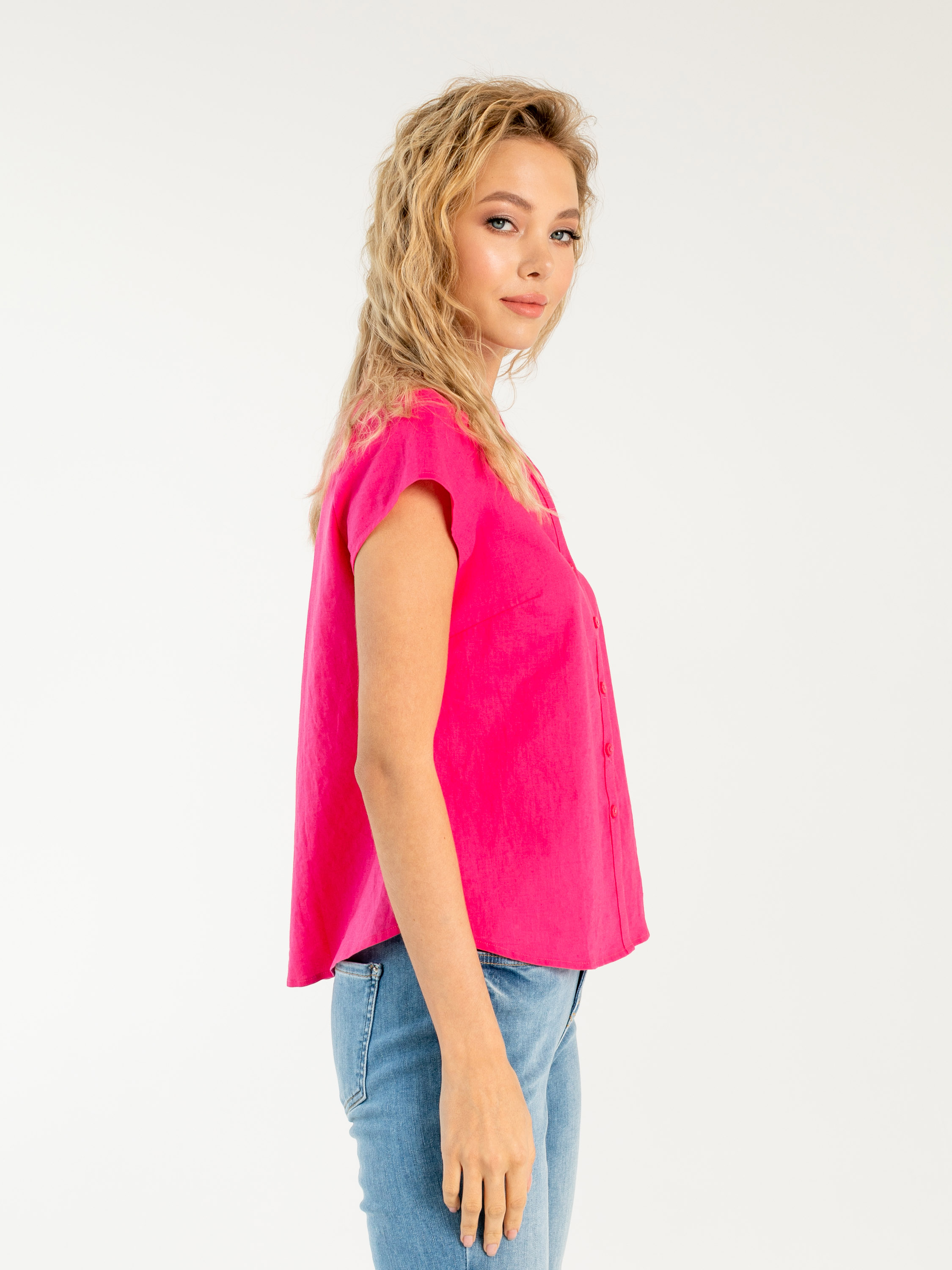 На сайте указаны российские размеры. Ткань: легкая ультрастильная блузка из смеси льна и хлопка. Дышащий материал, максимально приятный коже, позволяет носить изделие как летом, так и в межсезонье. Крой: свободный силуэт блузки и короткий рукав – максимум движения и комфорта для женщины, живущей активной жизнью. Изысканный V-образный вырез подчеркивает красоту шеи, не обнажая зону декольте, что позволяет создавать элегантные, но яркие образы на каждый день. Вытачки выгодно подчеркивают линию груди и добавляют женственности. Отделка: тонкая планка с рядом лаконичных пуговиц гармонизирует силуэт, создавая вертикаль. Блузка представлена в двух ультрастильных цветах – хитах последних сезонов. Блузка отлично сочетается как с летним ассортиментом – легкими юбками, шортами, свободными брюками и светлыми жакетами, так и с более теплыми вещами – уютным трикотажем и модным денимом из коллекции Stern.