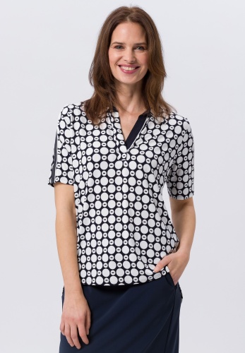 Повседневная спортивная рубашка-поло в элегантном стиле. Слегка удлиненная спинка с небольшими боковыми разрезами и летним V-образным вырезом.