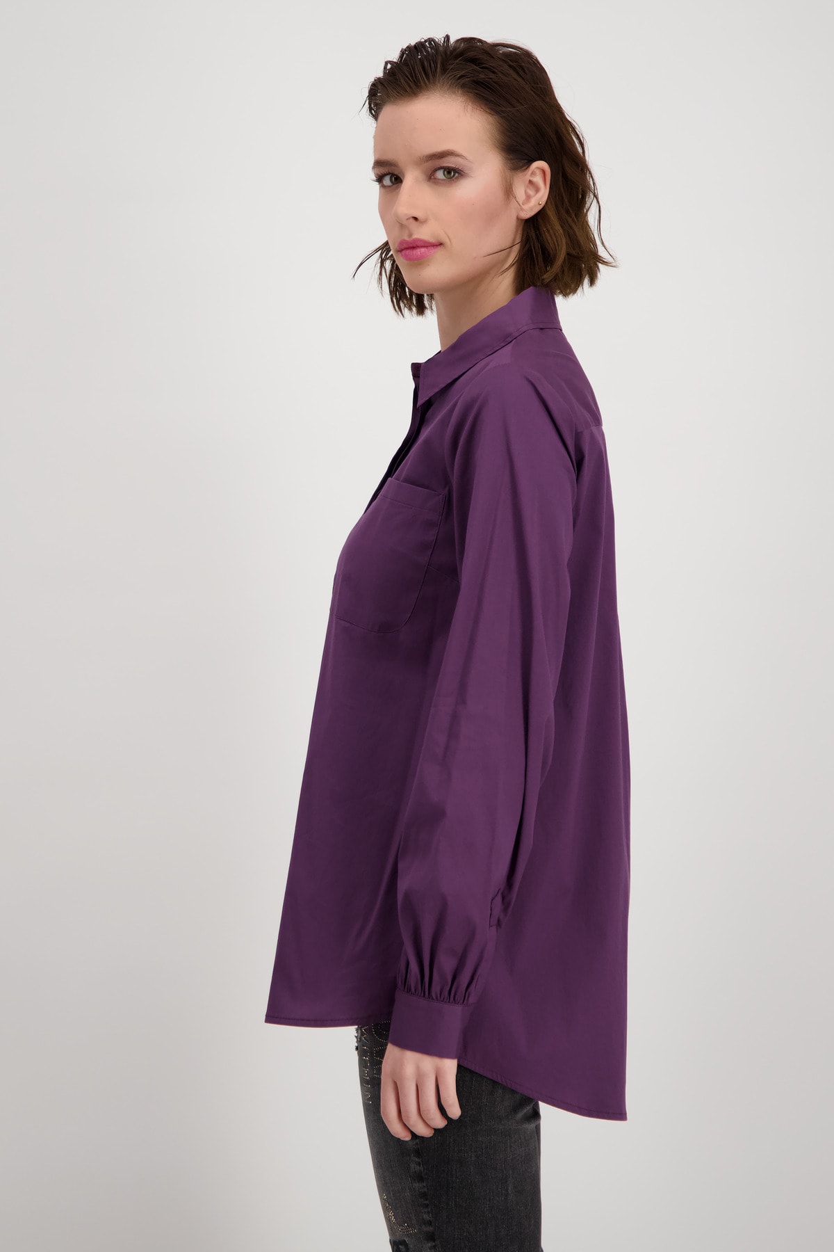 На сайте указаны российские размеры. Однотонная блуза-рубашка от monari. Стильная модель, которая вам понравится благодаря длинным рукавам с манжетами на пуговицах, длинному прямому крою с боковыми разрезами и удлиненному закругленному низу. Передняя часть имеет передний плечевой шов, накладной карман на уровне груди и планку на потайных пуговицах, а задняя часть украшена кокеткой с модной складкой. Рост модели 178 см Длина по спинке 44 размера составляет 79 см, а по переду – 74 см.