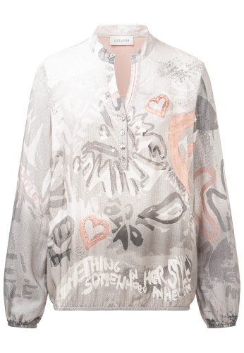 На сайте указаны российские размеры. Модная блуза с длинными рукавами и блестящими аппликациями из 100% вискозы. Эластичные ленты на кромке и манжетах рукавов также обещают высокий уровень комфорта. Наша модель ростом 177 см. Измерения для 44 размера: Окружность груди: 104 см Талия: 102 см Обхват бедер: 112 см. Длина по спинке: 62 см. Длина рукава: 62 см.