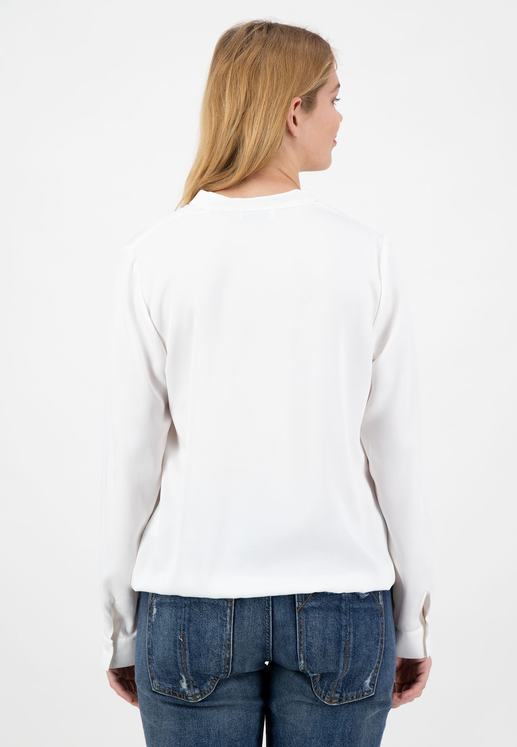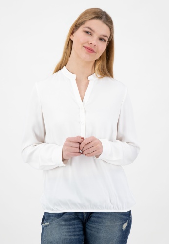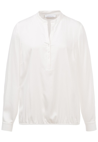 На сайте указаны российские размеры. Блузка-рубашка с длинными рукавами на резинке кремового цвета. Благодаря высококачественному материалу рубашка приобретает струящийся, легкий вид и слегка блестящий блеск. Блузка-рубашка идеально садится по фигуре благодаря резинке по низу. Свободный V-образный вырез с воротником-стойкой закрывает планка на половину пуговицы, эти же пуговицы есть и на манжетах. Наша модель ростом 177 см. Измерения для 44 размера: Окружность груди: 104 см Талия: 102 см Обхват бедер: 112 см. Длина по спинке: 62 см. Длина рукава: 62 см.