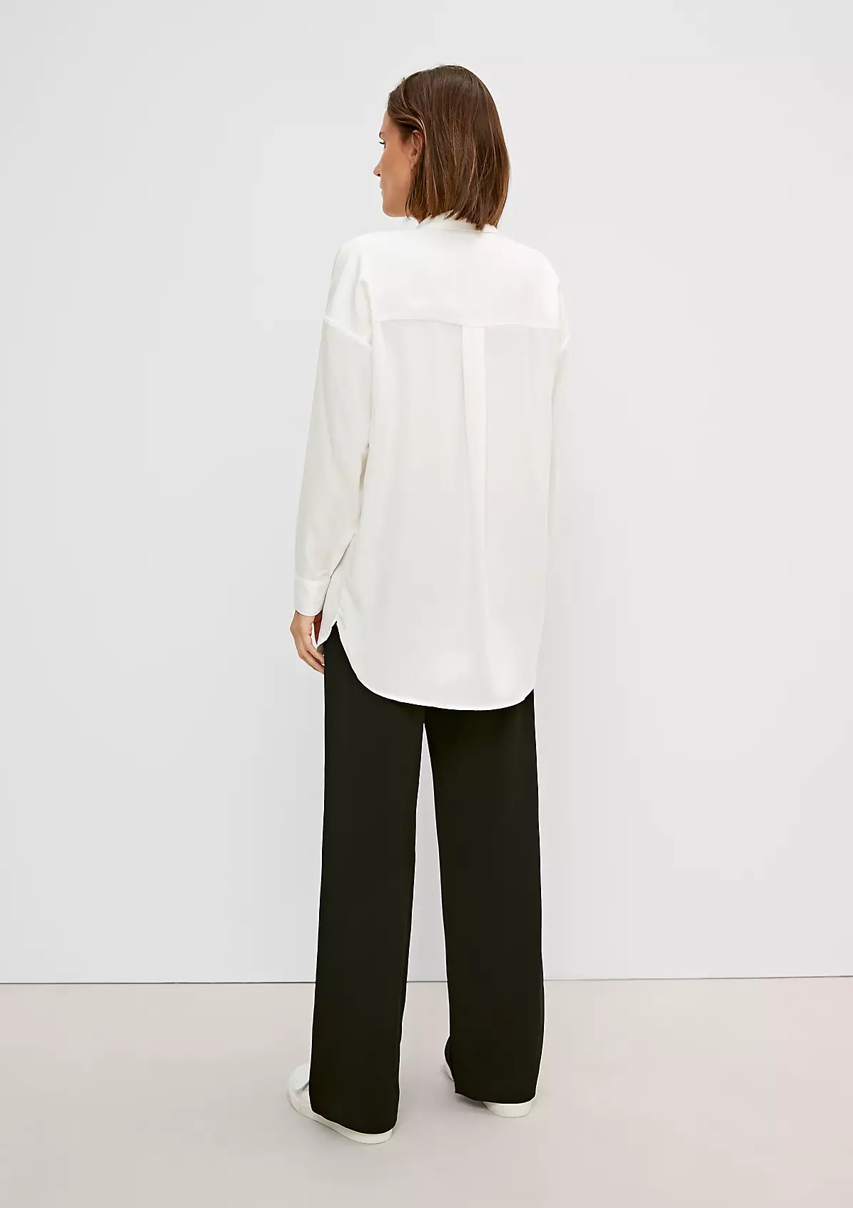 На сайте указаны российские размеры. Легкая классическая блуза с закругленным низом и разрезами сбоку. Застежка: планка с потайными пуговицами. Рукав: манжеты.