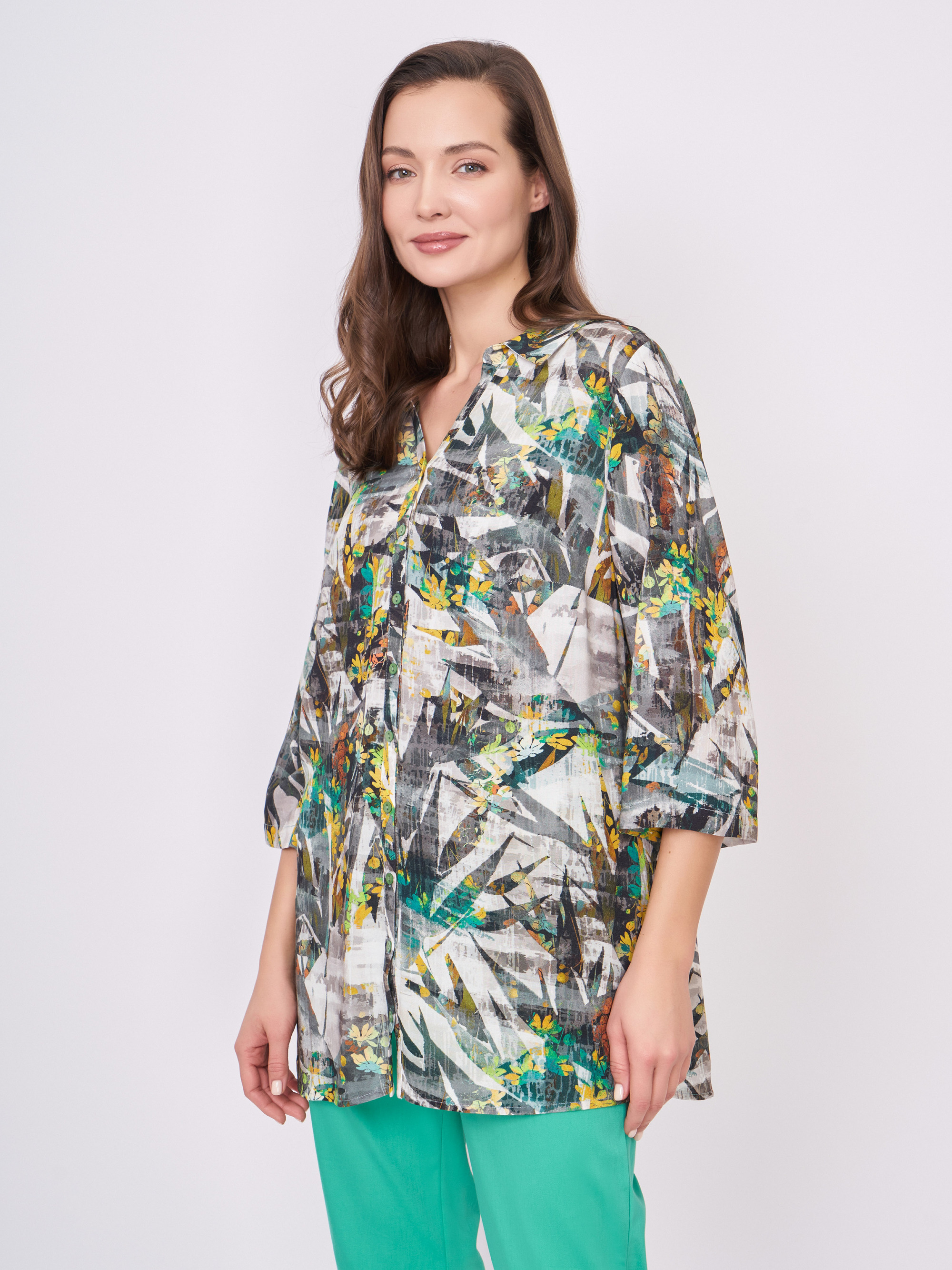 На сайте указаны российские размеры. Текстильная прямая зелено-серая блузка на пуговицах, с отложным воротником, с укороченным рукавом 3/4, с цветочным рисунком. Длина по спинке: 77 см. Рост модели: 177 см.