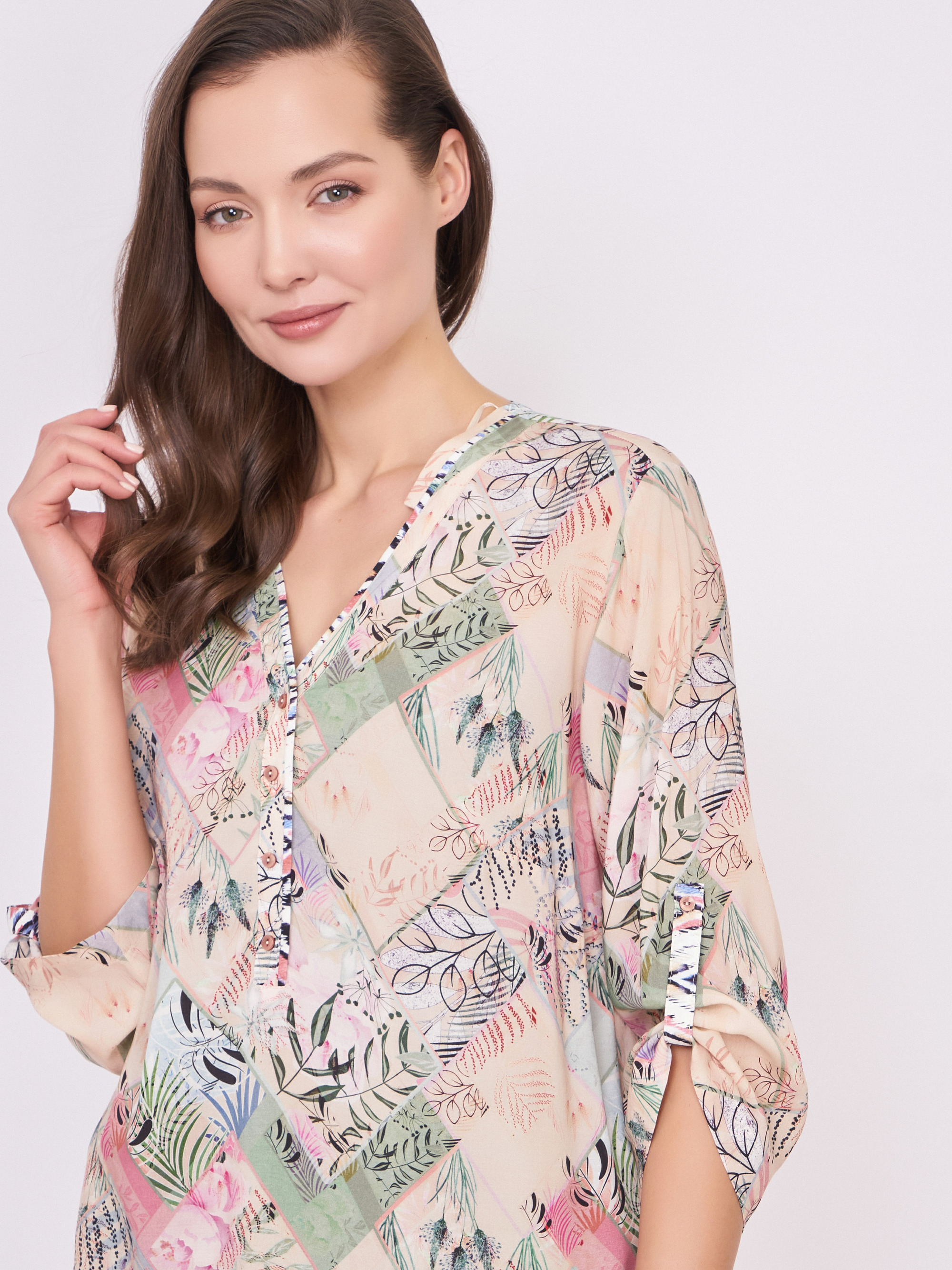 На сайте указаны российские размеры. Прямая текстильная персиково-розово-зеленая блузка на пуговицах, с V-образным вырезом, с укороченным рукавом 3/4, с цветочным рисунком. Длина по спинке: 66 см. Рост модели: 177 см.